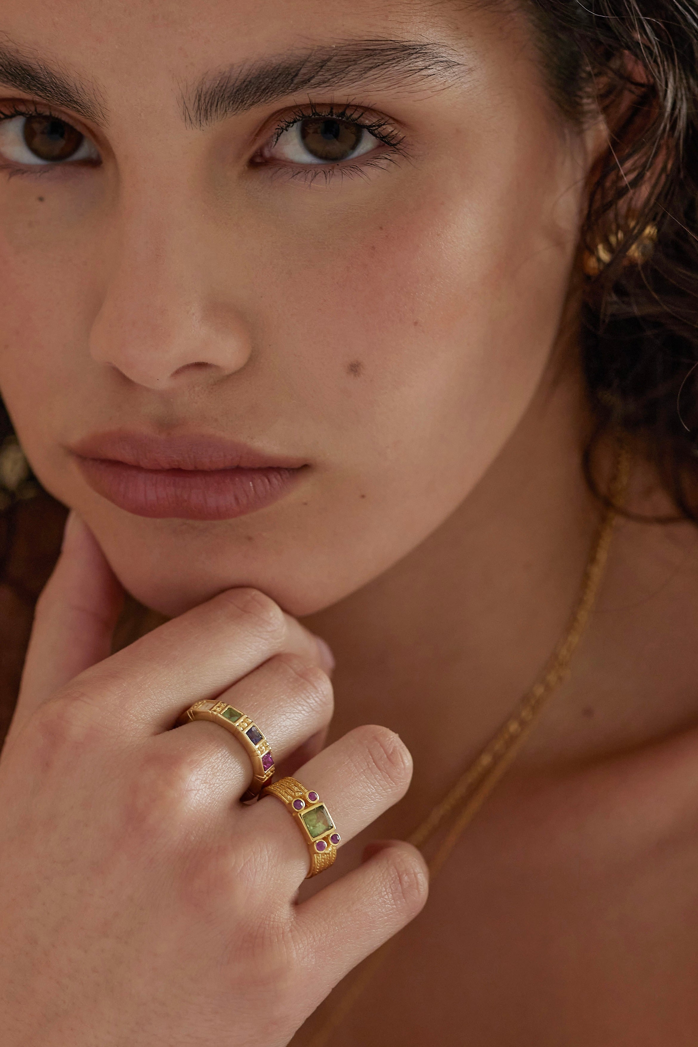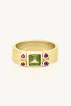 The Adela Ring features a baguette Apatite, bezel-set at the centre and flanked by four natural Rubies - two on either side. Together, the vibrant stones form a striking silhouette. Fine detailing adds subtle texture, making this piece a perfect match to the Adela Necklace or a standout on its own.