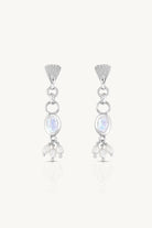 A finely etched fan motif sits at the stud, dropping to an oval bezel-set Moonstone through a double-looped hinge that adds gentle movement.