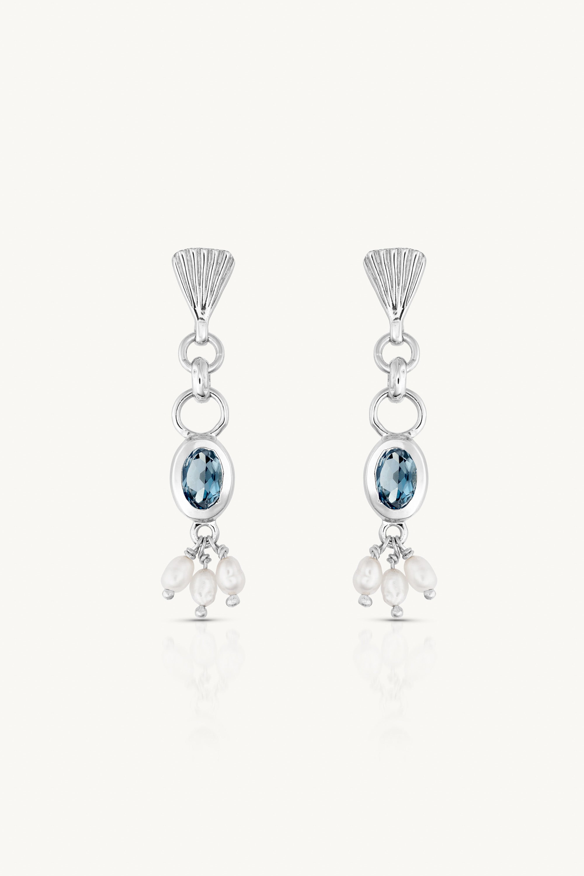 A finely etched fan motif sits at the stud, dropping to an oval bezel-set London Blue Topaz through a double-looped hinge that adds gentle movement.