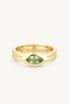 The Amara Marquise Ring features a handcut bezel set Apatite stone in it's centre - a stone long believed to inspire clarity and truth.