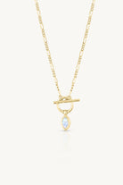 Crafted on a bold Figaro chain, this necklace features a front toggle clasp with a natural marquise-cut Moonstone suspended from the centre. Bezel set to show off its soft, shifting glow - a wearable reminder to lead with light.