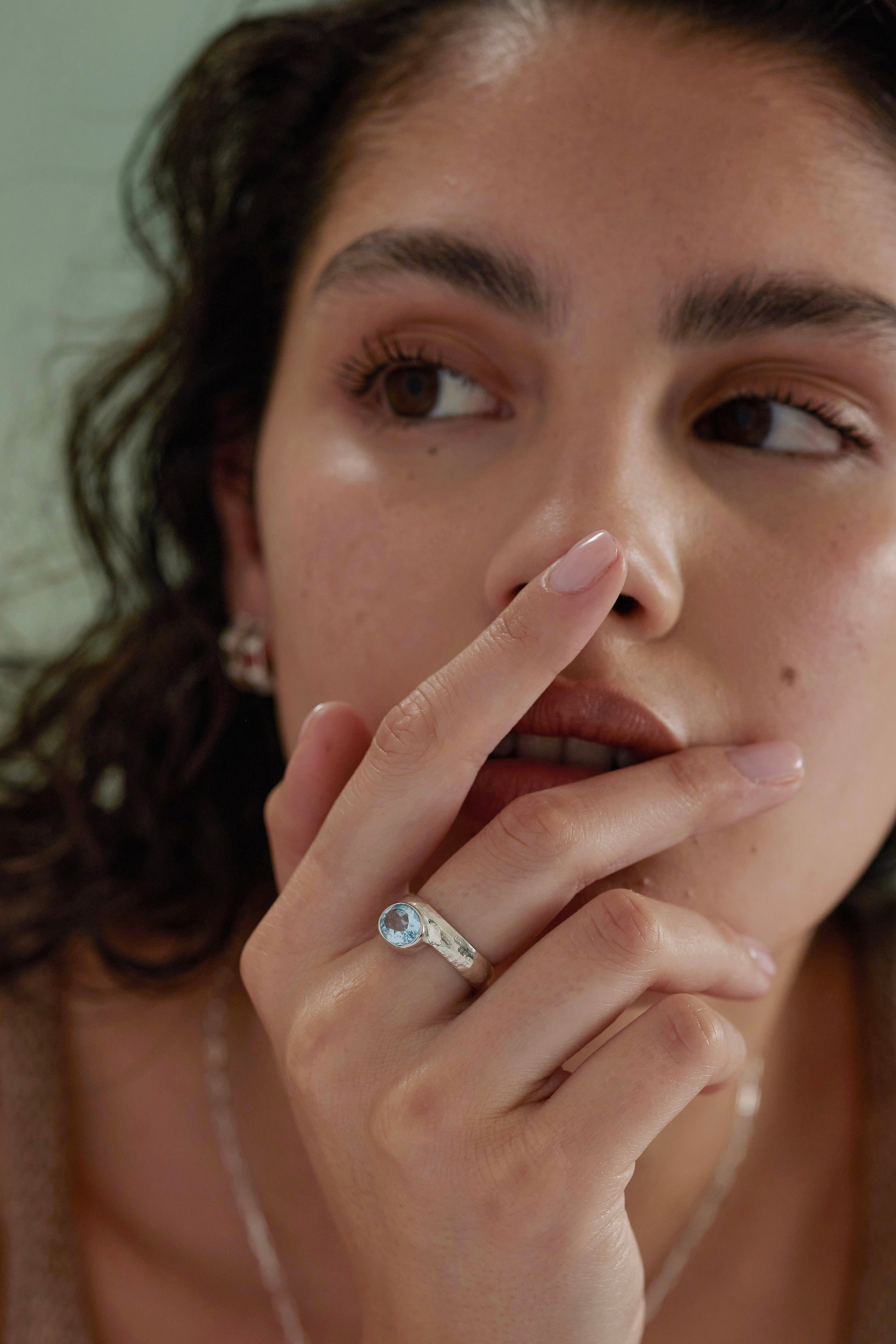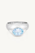 The Odessa Ring features a thick, hammered band and a brilliant Blue Topaz, bezel-set beyond the edge.