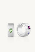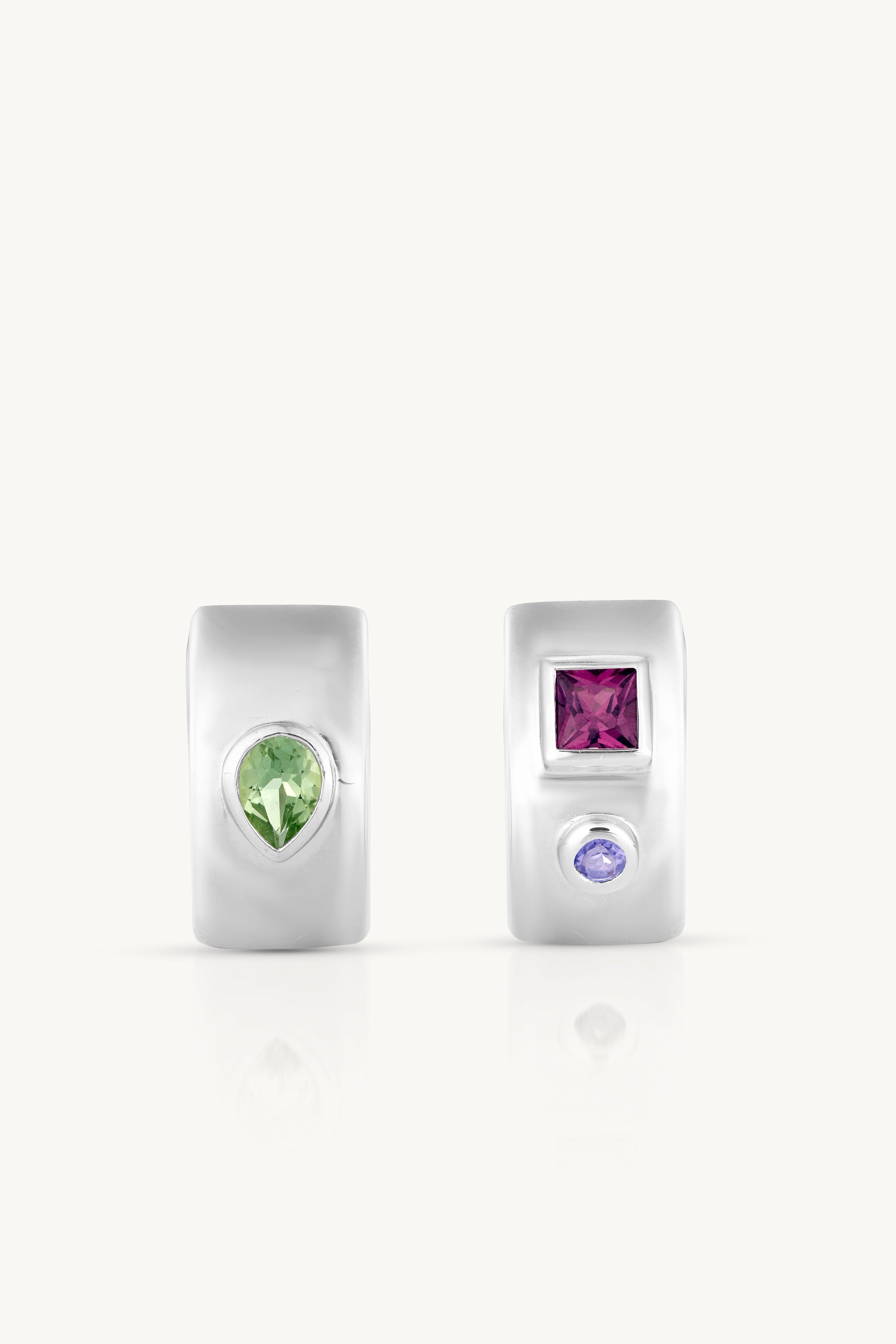 One huggie holds a solo pear-cut Apatite, bezel set and bright with colour. The other stacks square Rhodolite and round Iolite - rich and striking.