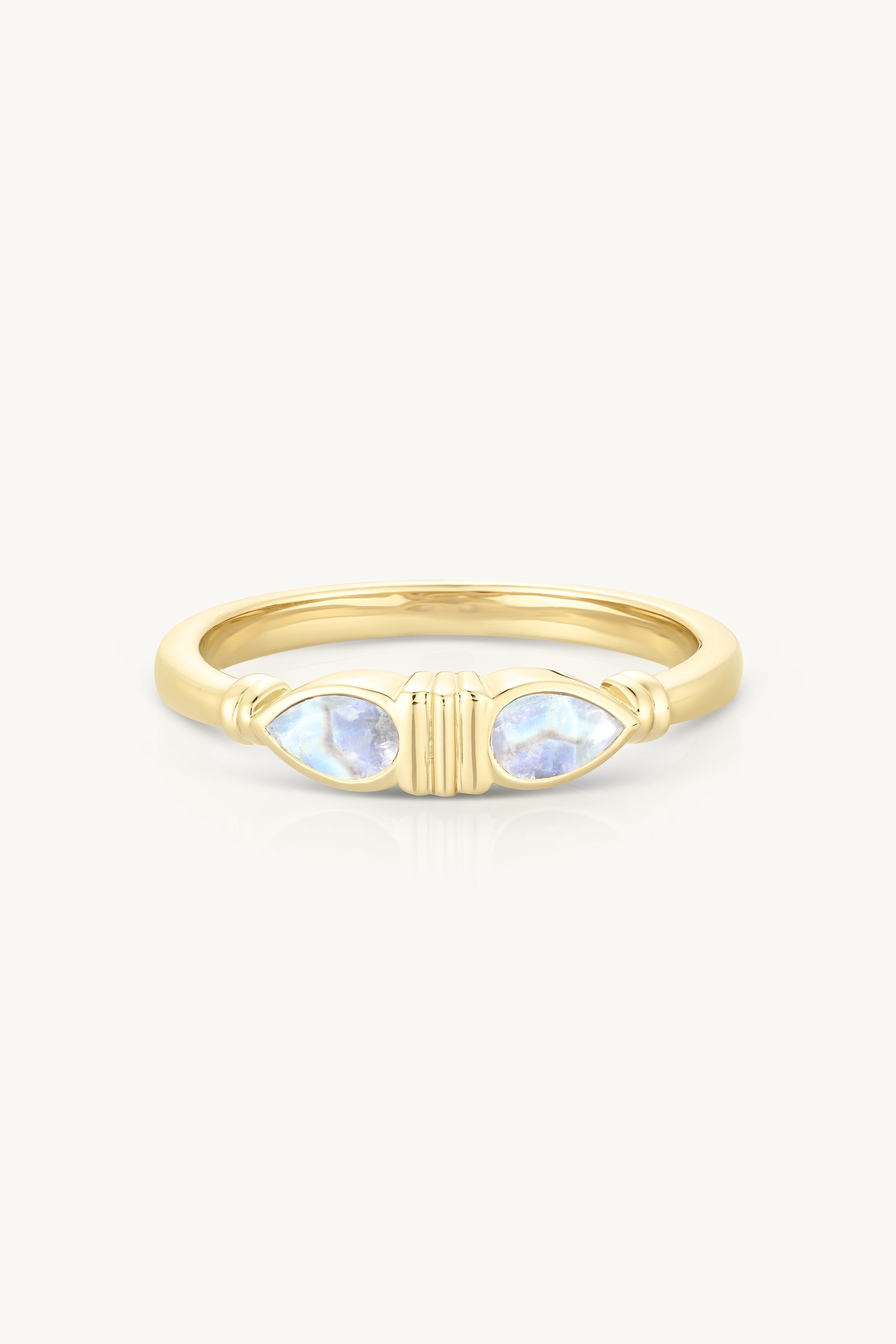 With twin pear-cut Moonstones bezel-set at its centre, this ring brings effortless colour and strength to your collection. The two stones are beautifully framed by fine line detailing, adding a touch of texture and dimension between and alongside them.
