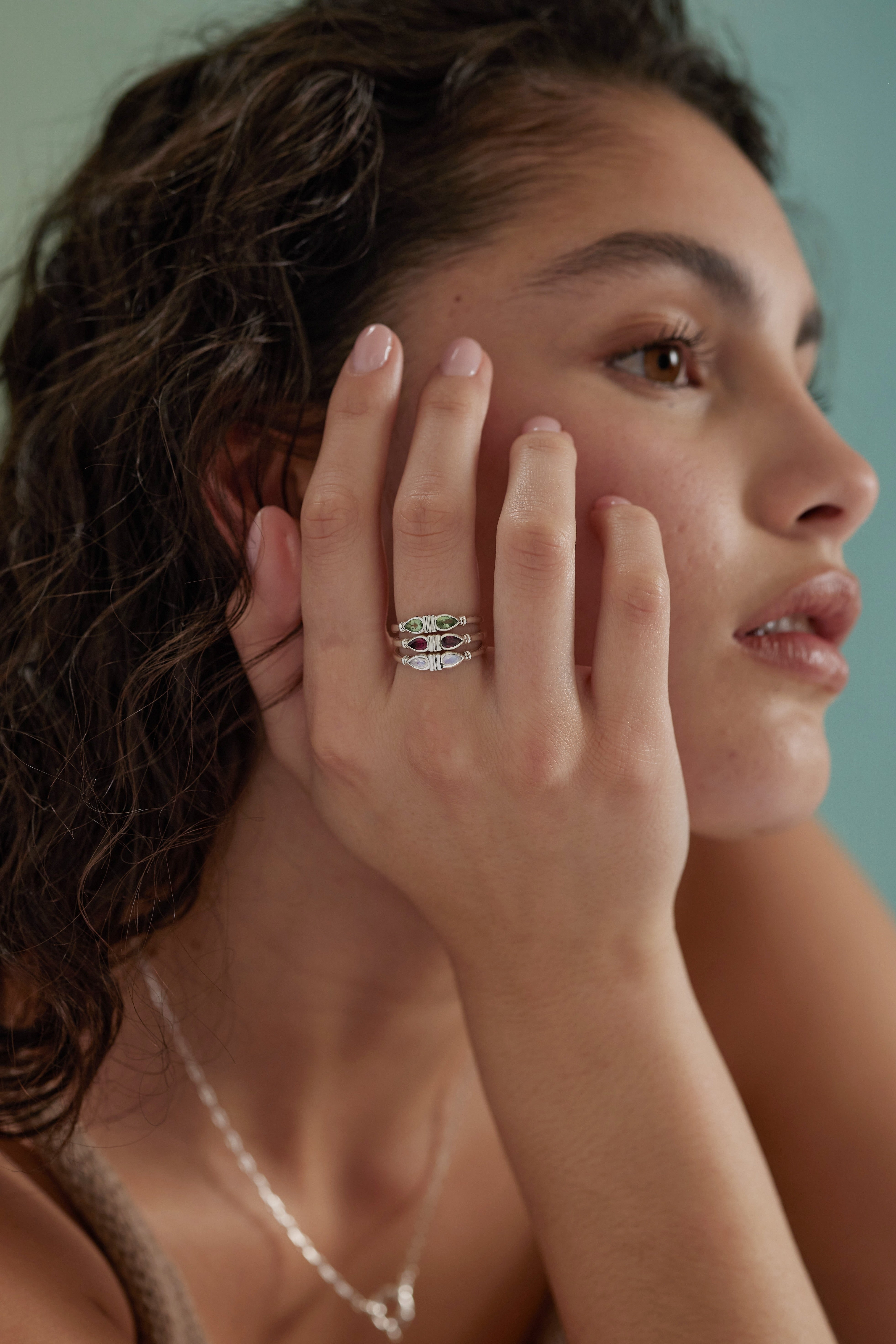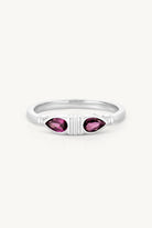 With twin pear-cut Rhodolites bezel-set at its centre, this ring brings effortless colour and strength to your collection. The two stones are beautifully framed by fine line detailing, adding a touch of texture and dimension between and alongside them.