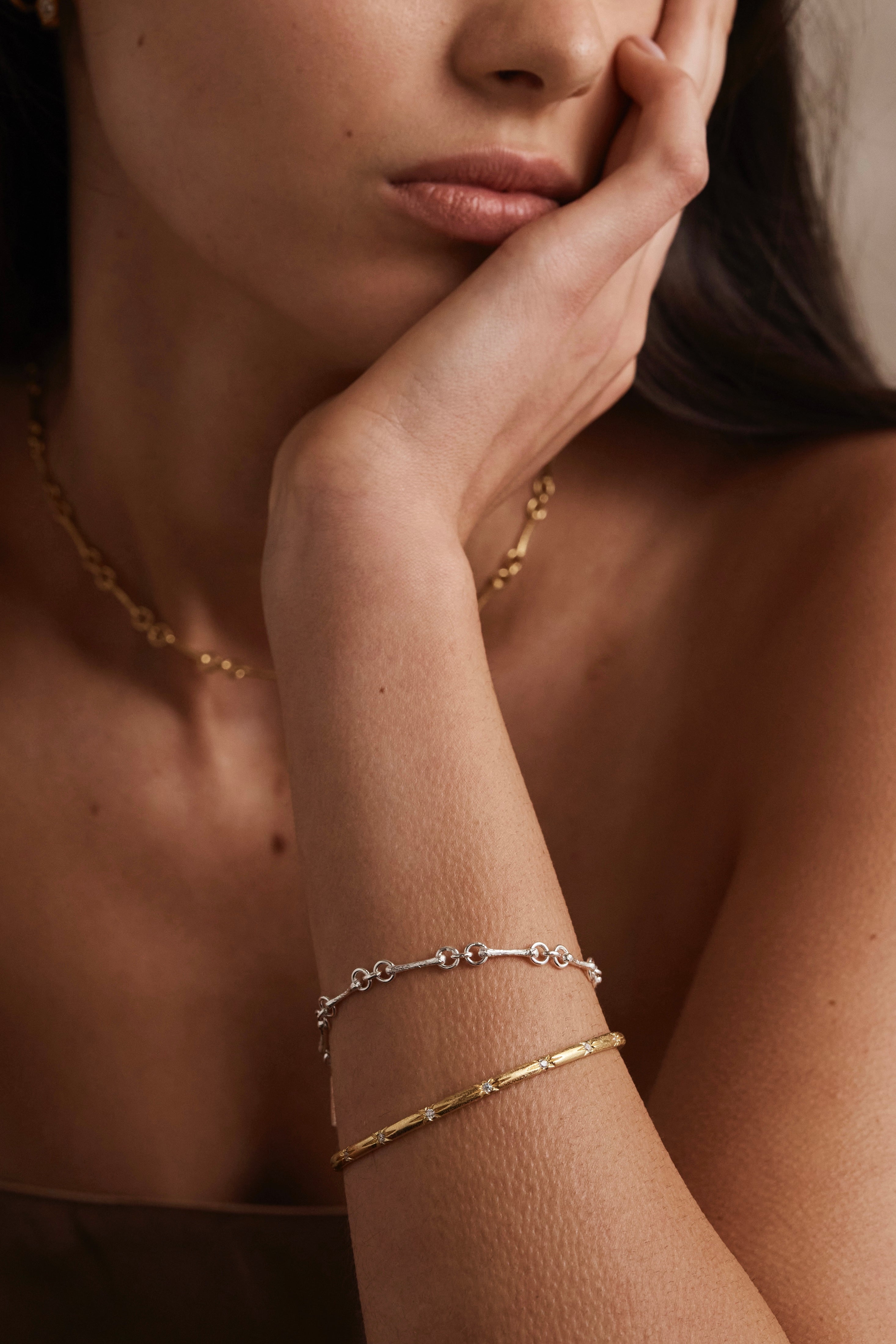 Crafted with lightly textured, organically shaped bars and smooth round links, it shines on its own or takes its place in your favourite wrist stack.