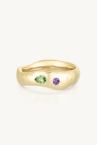 Its organically shaped, hammered band cradles a pear-shaped Apatite and round Amethyst - flush set into the surface like treasures tucked into stone.