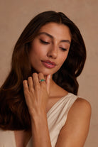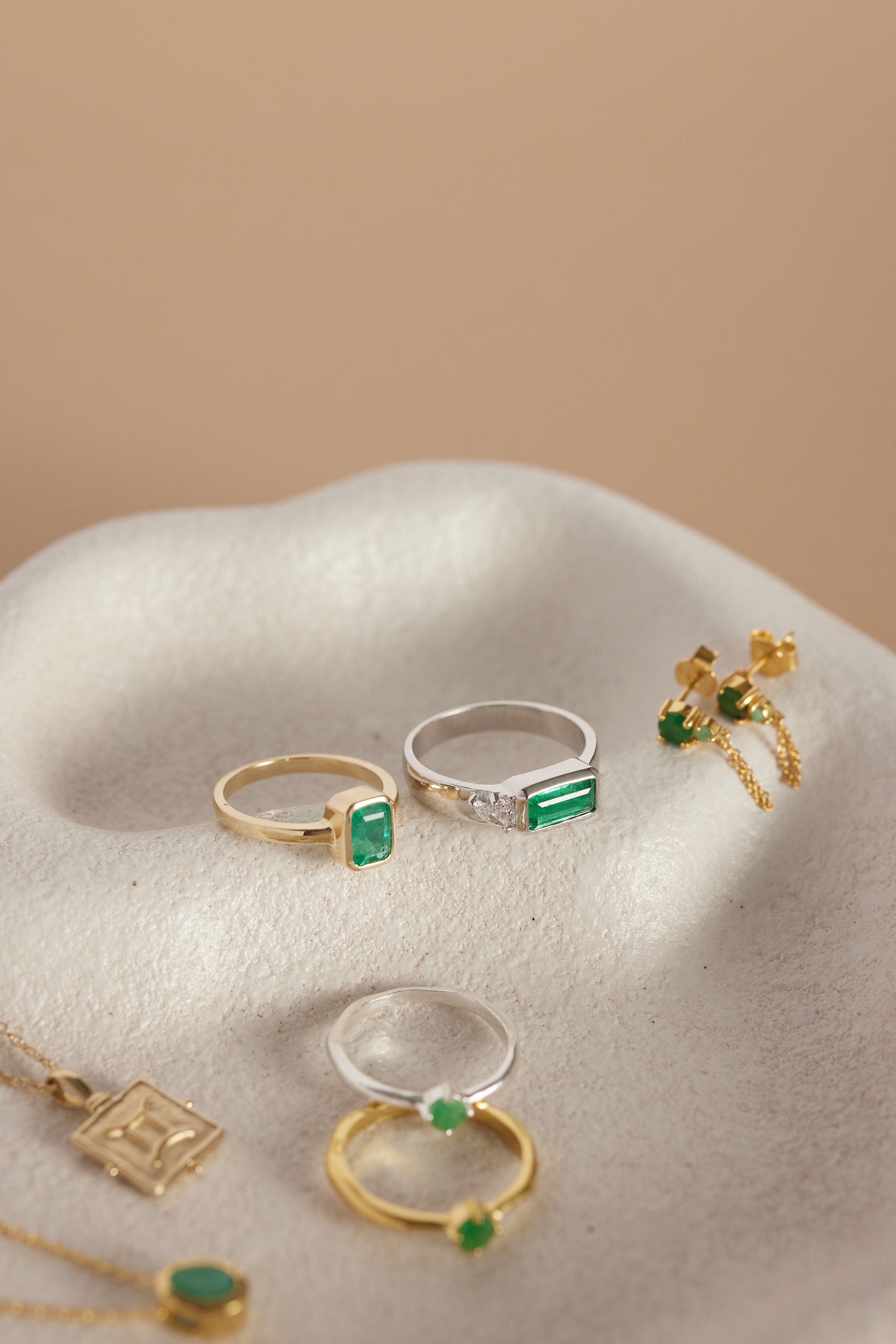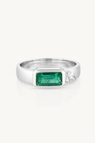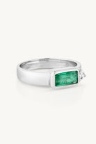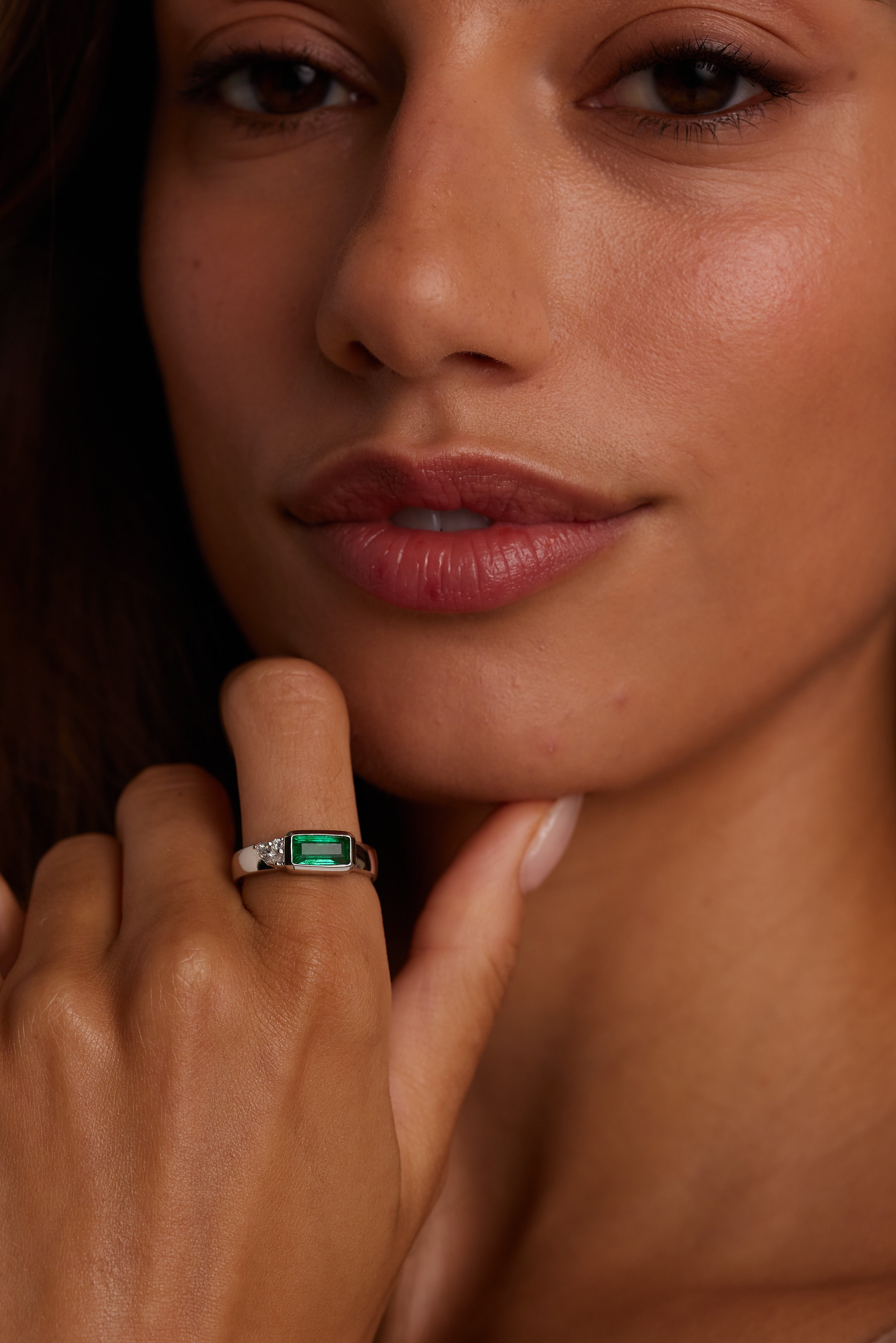 A delicate dance between bold and refined. This one of a kind solid gold ring features a baguette Emerald in a soft bezel setting, paired with a claw set White Diamond that dances in the light.