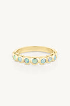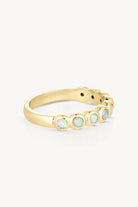 This Solid Gold Opal Bezel Band features a half-round design lined with bezel-set Australian Opals in a deep, captivating blue. Each Opal catches the light in its own unique way, creating a subtle shimmer that dances with every movement.