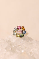The Tourmaline Halo Cluster Band features a baguette-cut Tourmaline at its centre, framed by a circle of prong-set Tourmalines, each in a different cut and hue.