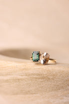 The Twin Morganite & Sapphire Band pairs a soft blush oval Morganite with a blue emerald-cut Sapphire, each prong-set and gently angled toward one another.