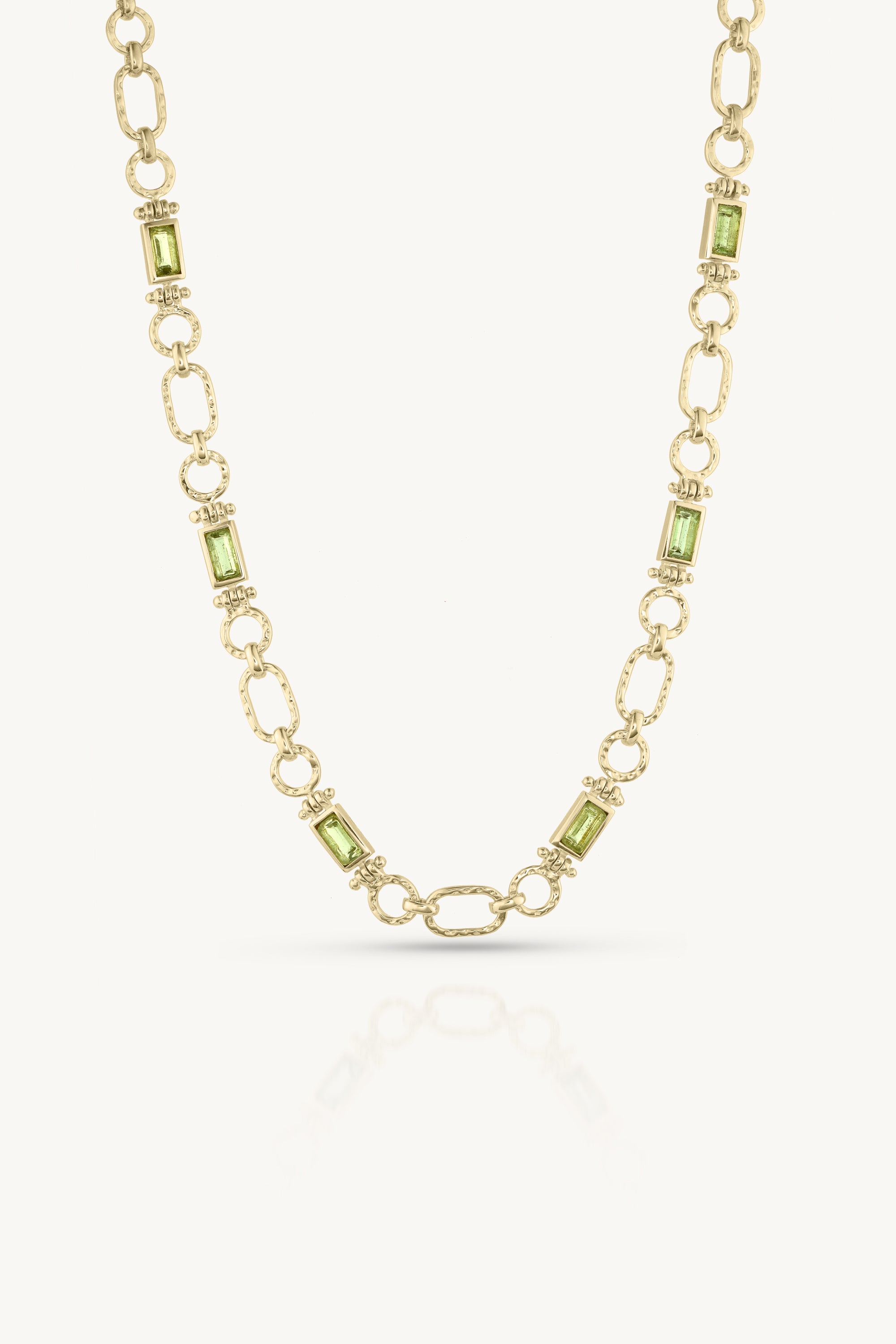 The Petra Necklace is a true testament to craftsmanship. Handcrafted with precision, its unique link chain design and baguette-cut Apatite stones come together in a standout piece.