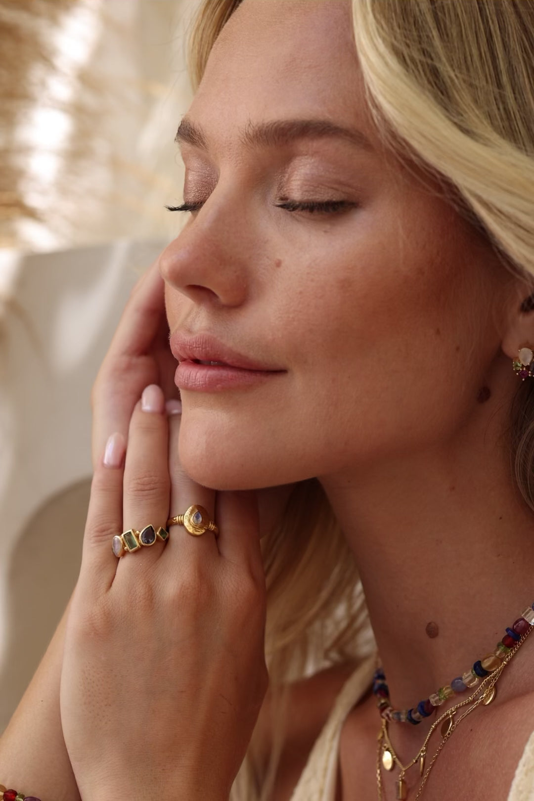 The Nova Cluster band is a colourful statement ring set with a pop of colour with green Apatite, violet Iolite and Rainbow Moonstone.