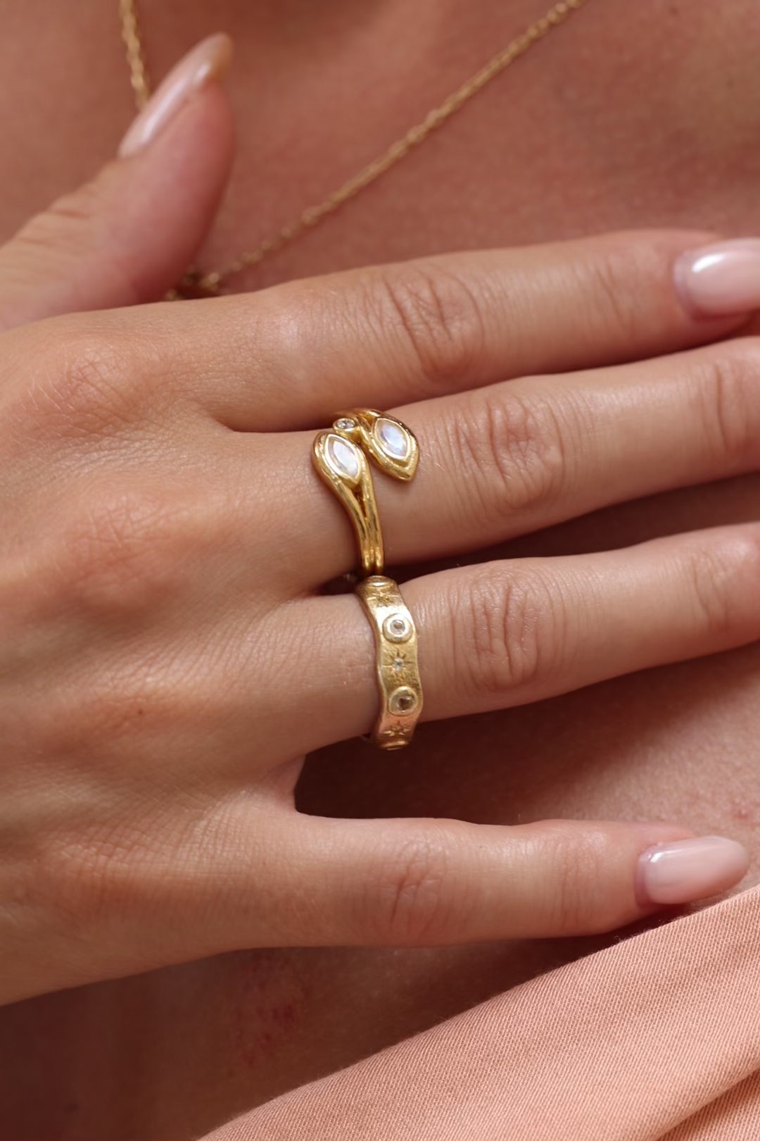 Inspired by the stars, the Cosmic Ring brings forth the night sky. This organically shaped band showcases White Topaz, gleaming at the centre of each starburst and framed in bezel settings on either side along the band.