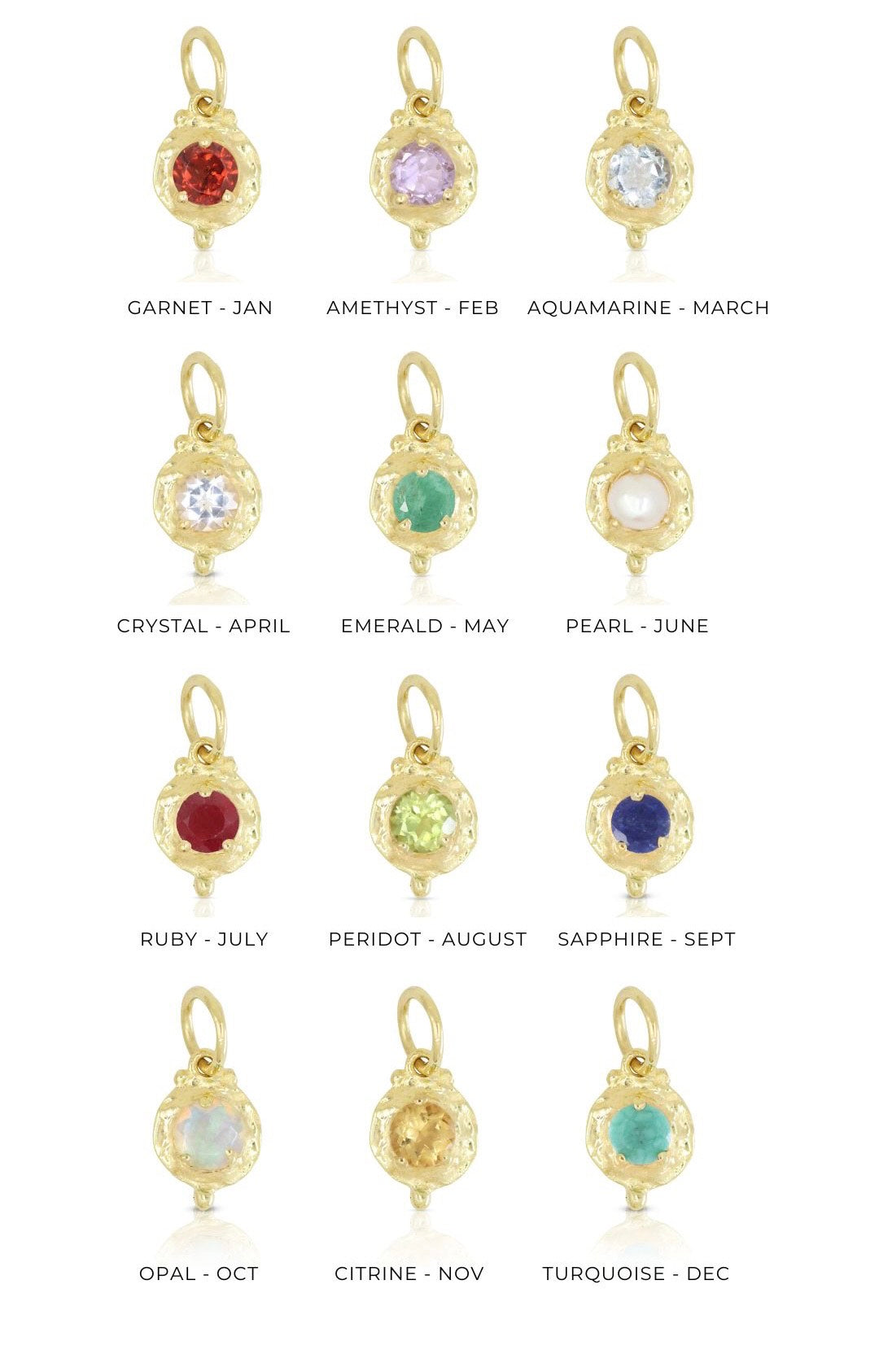 • Garnet, Amethyst, Aquamarine, White Topaz, Emerald, Pearl, Ruby, Peridot, Sapphire, Opal, Citrine and Turquoise