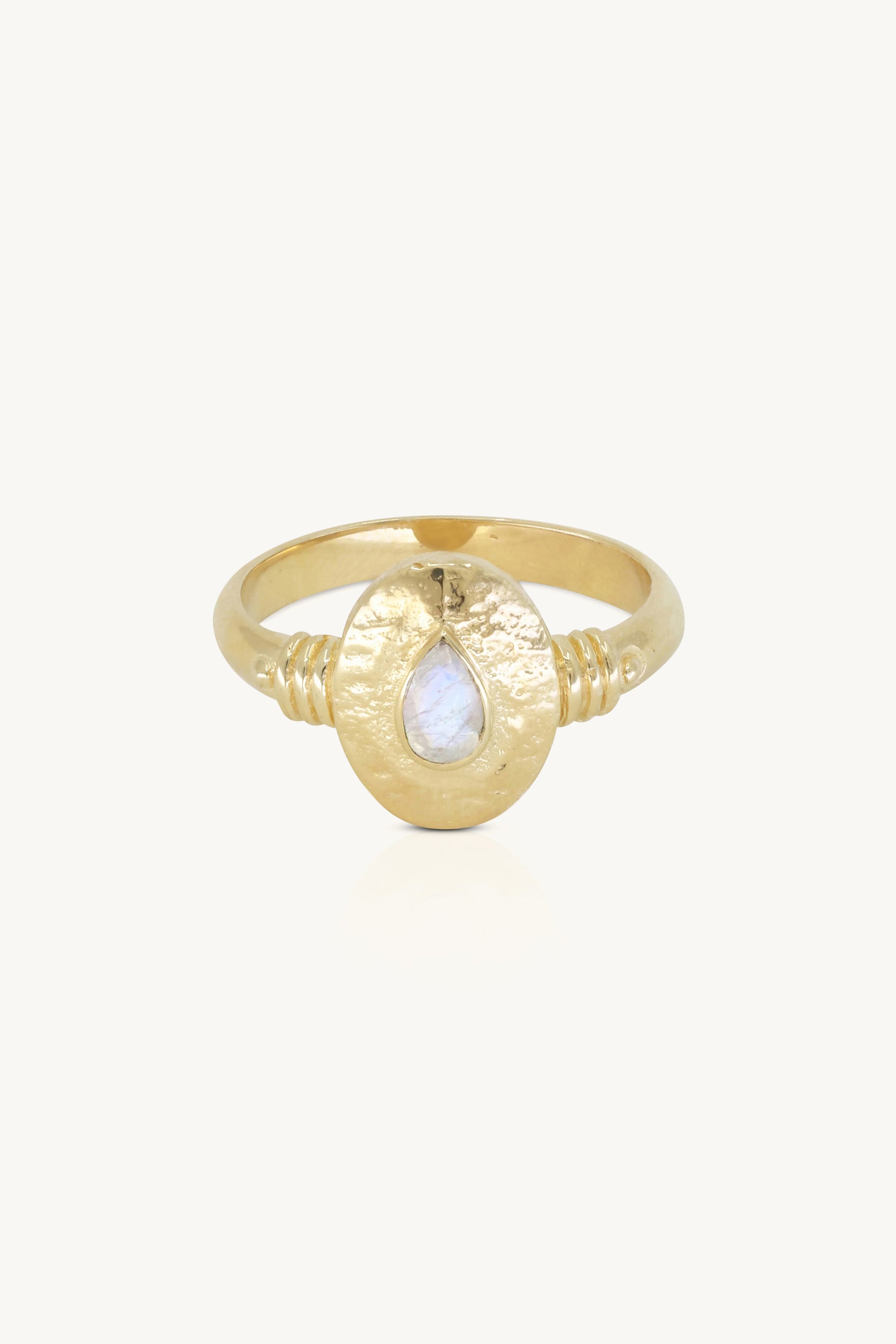 Our Esme ring features a stunning hand cut pear stone set into a delicate hand hammered distressed shield with banded detail on it's side.