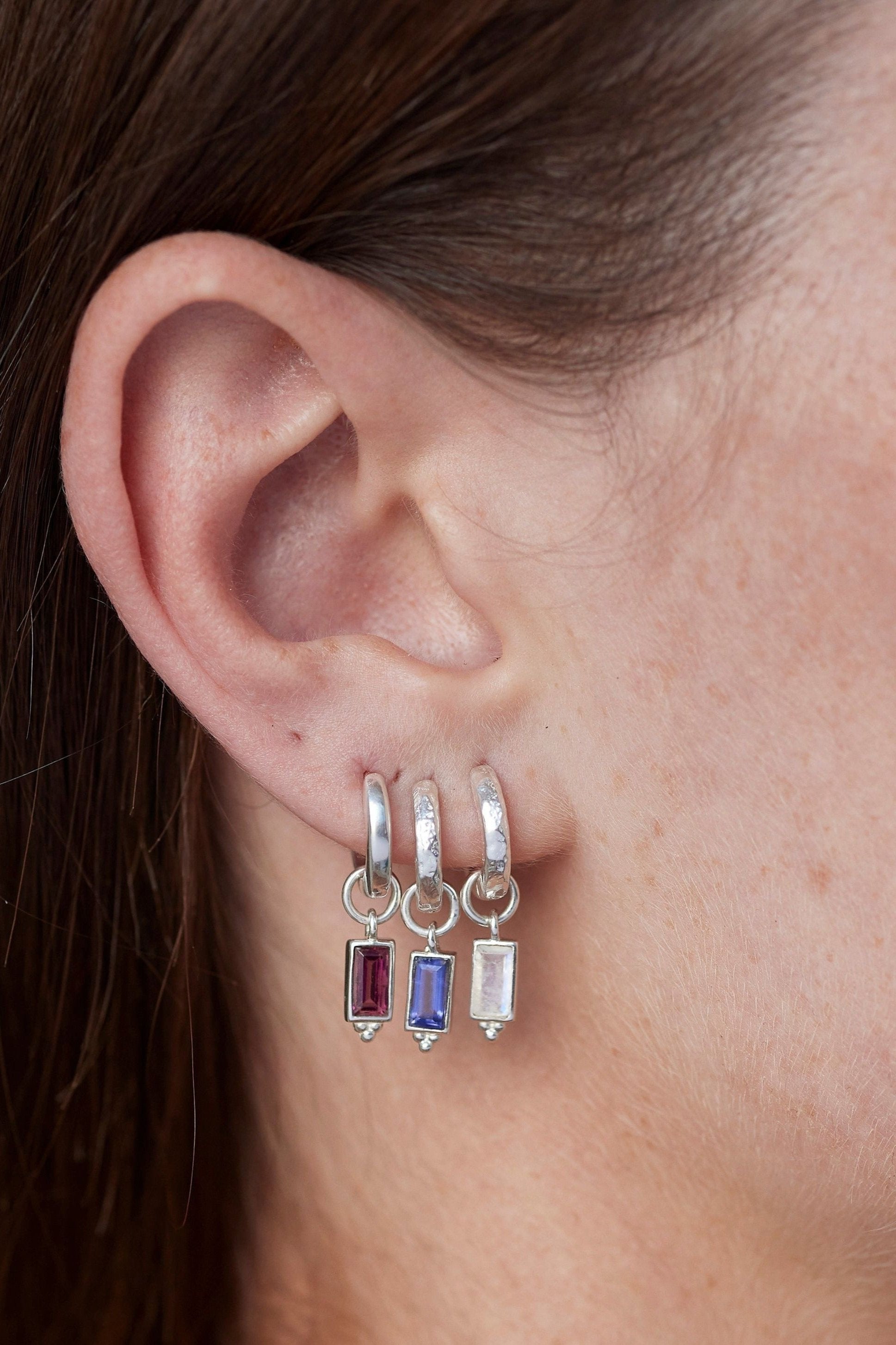 The Baguette Earring Charm features a stunning hand cut stone held securely in a delicate bezel setting with signature ball detailing at the bottom.