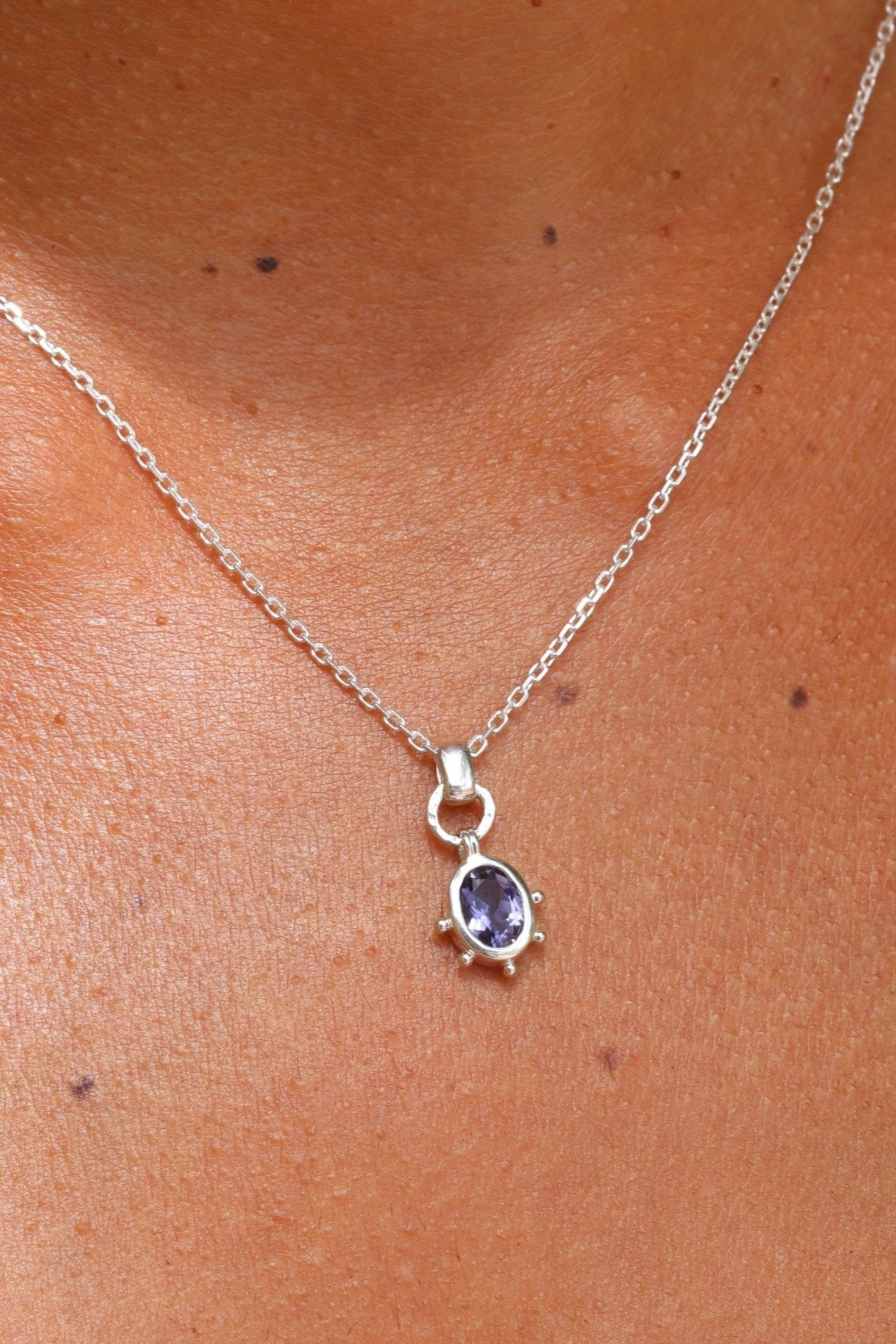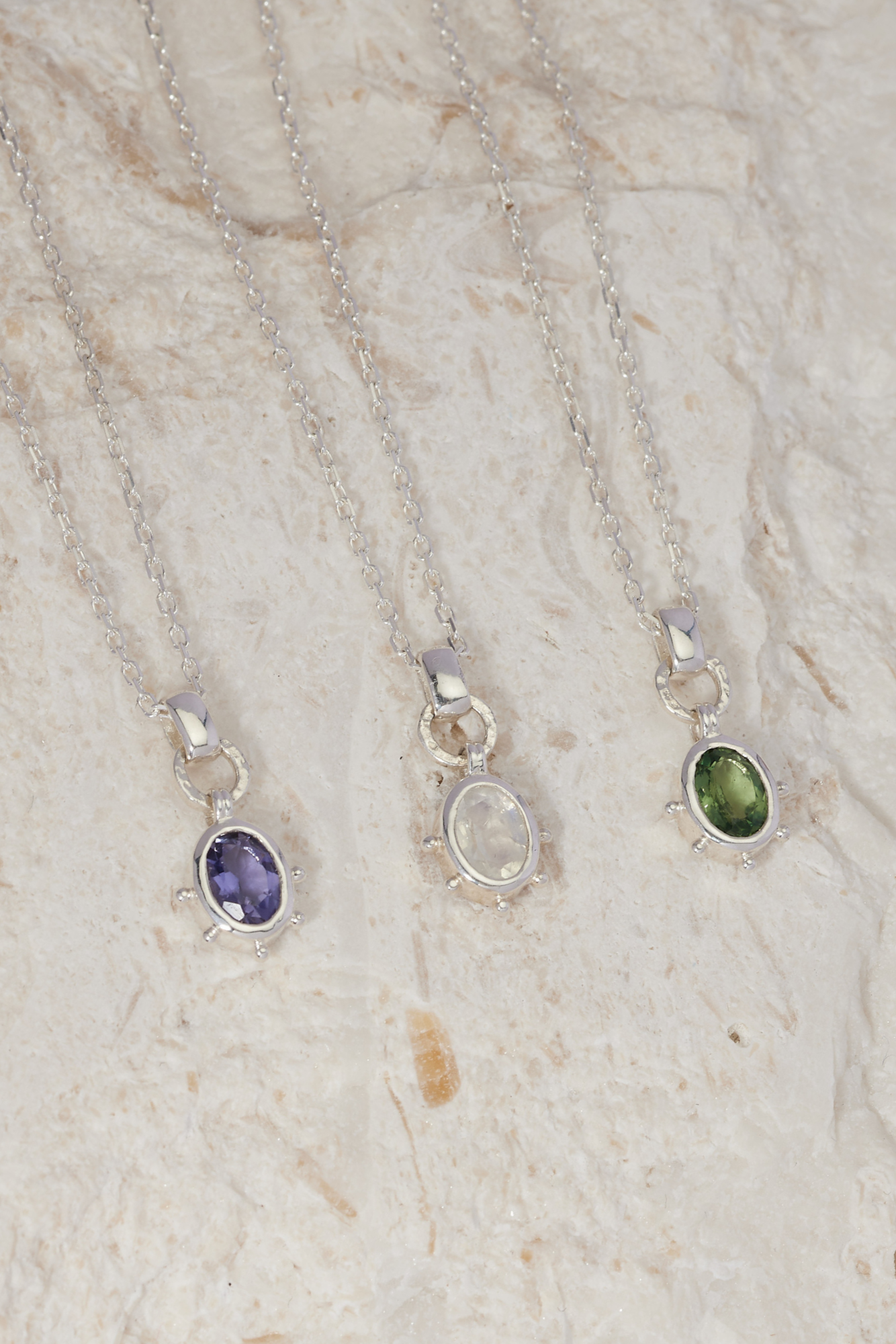 Our Gia Necklace features a luminous hand faceted oval stone, bezel set with small ball detailing. This is the perfect mid length layering necklace.
