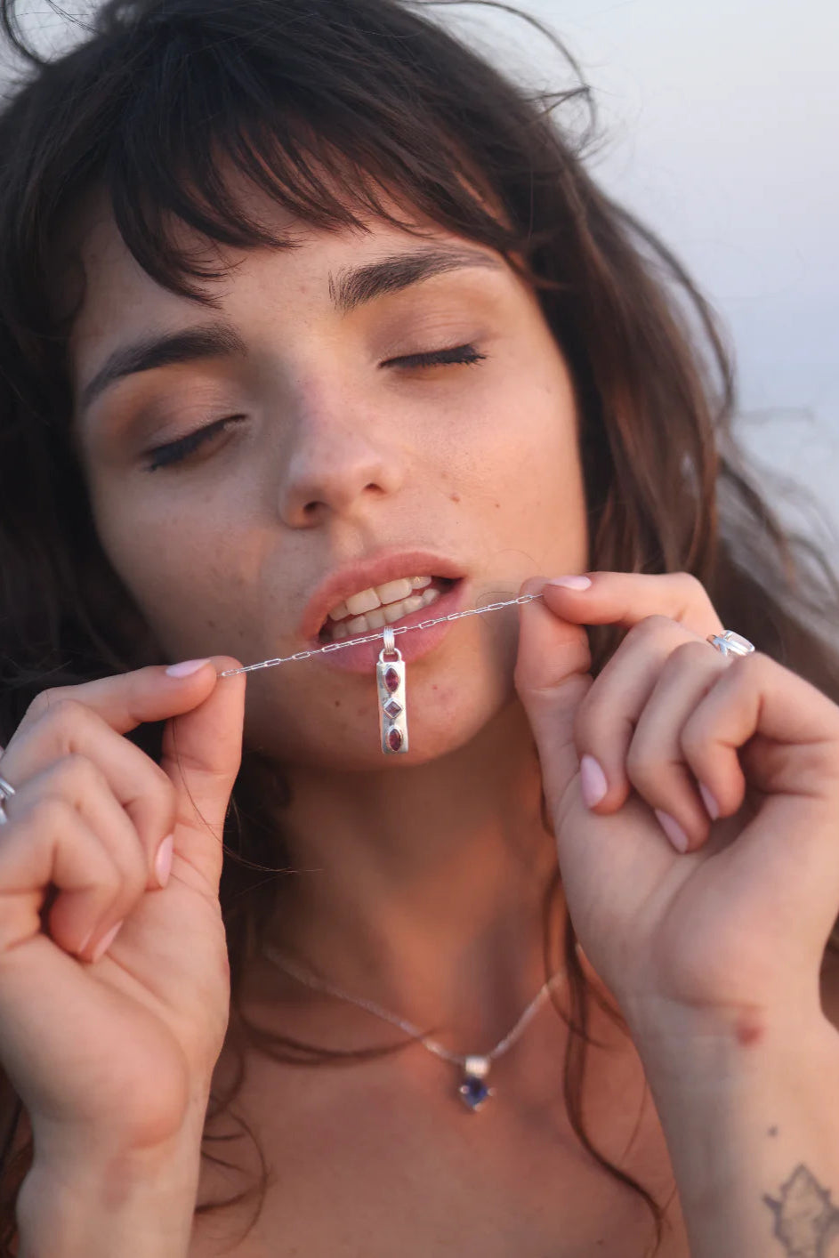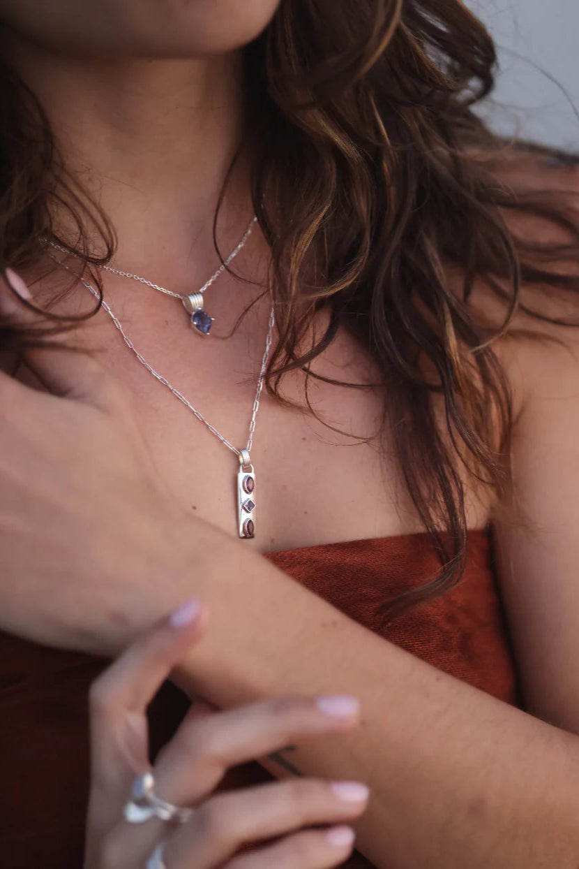 The Coronet Pendant features 3 hand cut stones (2 marquise and 1 baguette) bezel set in a vertical solid bar style pendant. Set on a paperclip chain this is the perfect long line necklace for layering as it can be worn at 3 different lengths on the chain.