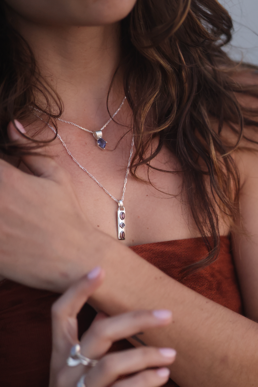 The Coronet Pendant features 3 hand cut stones (2 marquise and 1 baguette) bezel set in a vertical solid bar style pendant. Set on a paperclip chain this is the perfect long line necklace for layering as it can be worn at 3 different lengths on the chain.