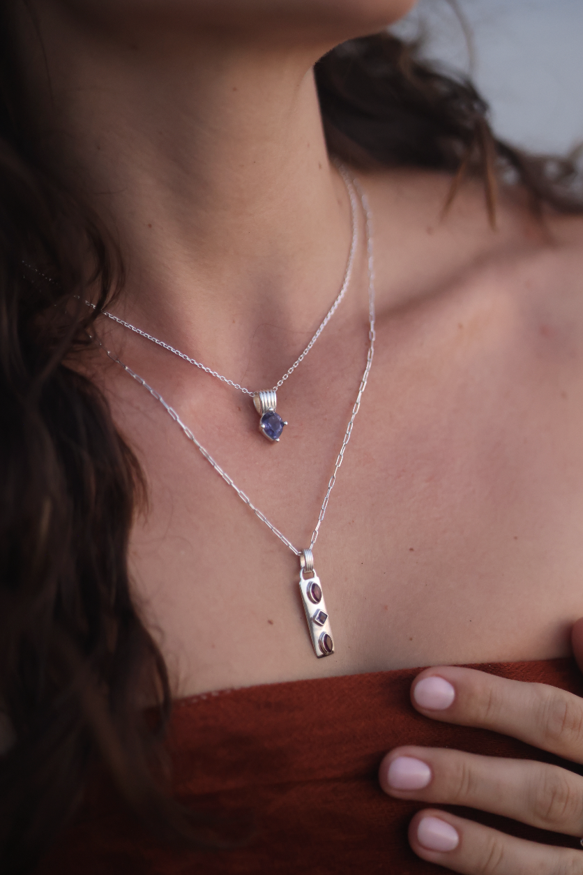 The style of this necklace is designed to match with our Coronet Hoops and Coronet Ring and is available in a Moonstone, Rhodolite/Iolite mixed and Apatite version.