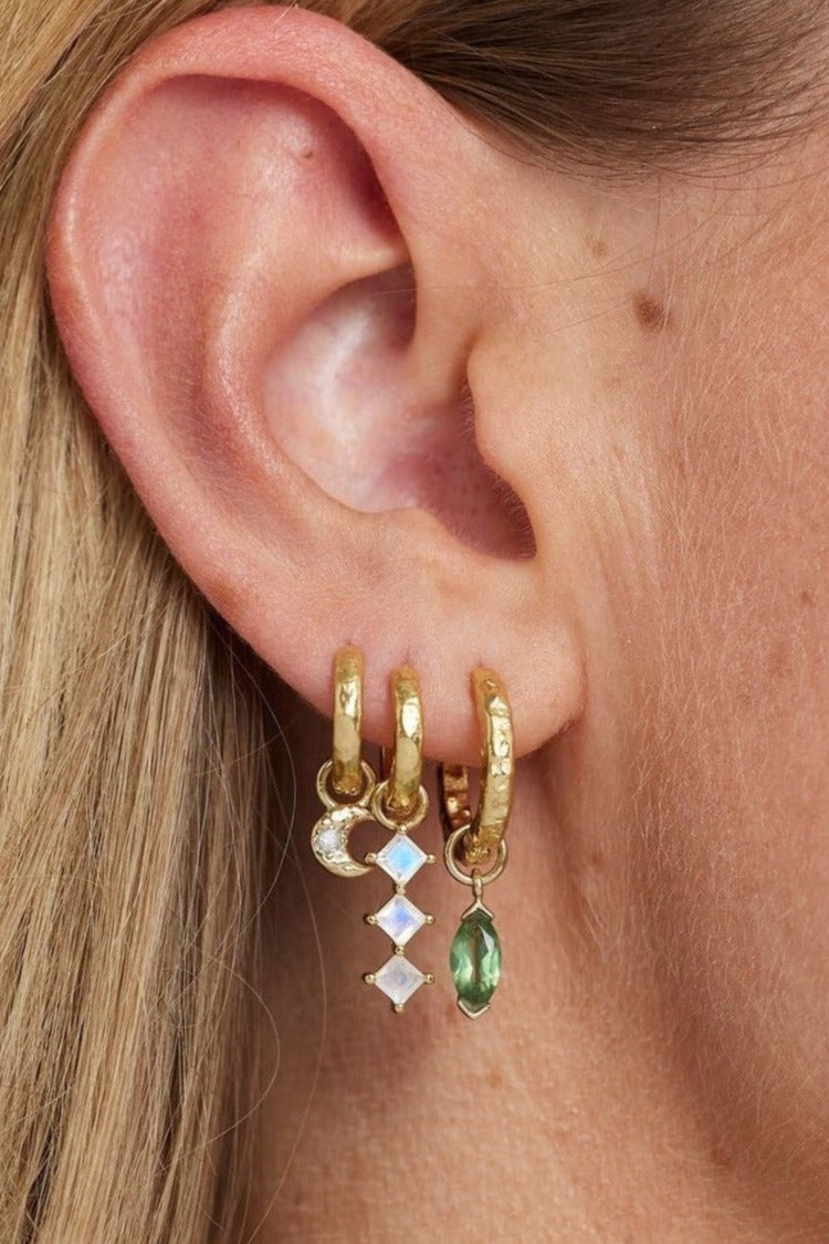 The Marquise Earring Charm is available in 4 stone options with Apatite, Moonstone, Iolite and Rhodolite.