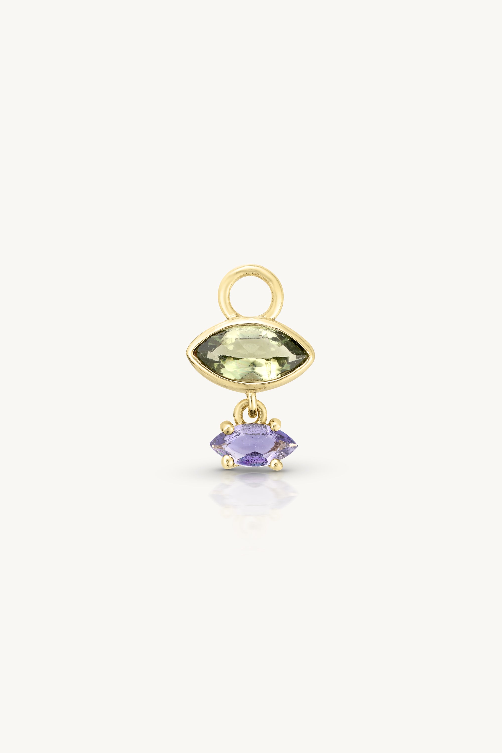 The Mila Earring Charms are available in 4 stone options, Apatite & Iolite (silver only), Iolite & Rhodolite (gold only), Sapphire & Moonstone along with an all moonstone option. The larger 8x4mm marquise stone is bezel set and fixed to it's above loop, where as the smaller marquise stone 5x3mm is claw set and swings freely from the stone above.