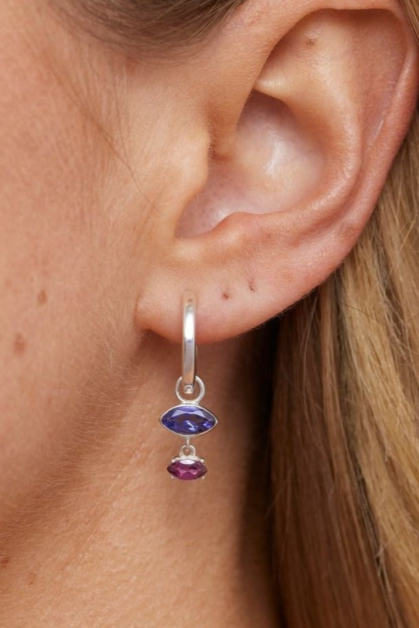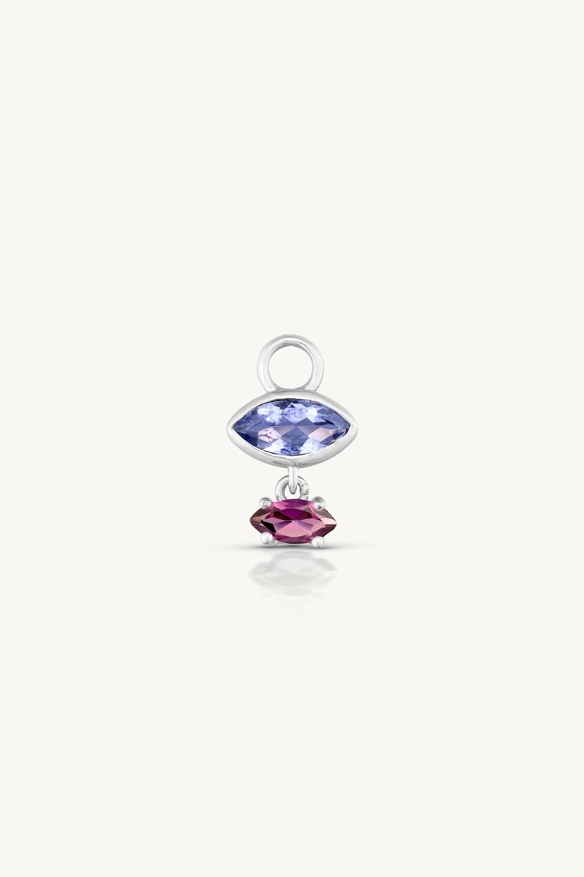 The Mila Earring Charms are available in 4 stone options, Apatite & Iolite (silver only), Iolite & Rhodolite (gold only), Sapphire & Moonstone along with an all moonstone option. The larger 8x4mm marquise stone is bezel set and fixed to it's above loop, where as the smaller marquise stone 5x3mm is claw set and swings freely from the stone above.
