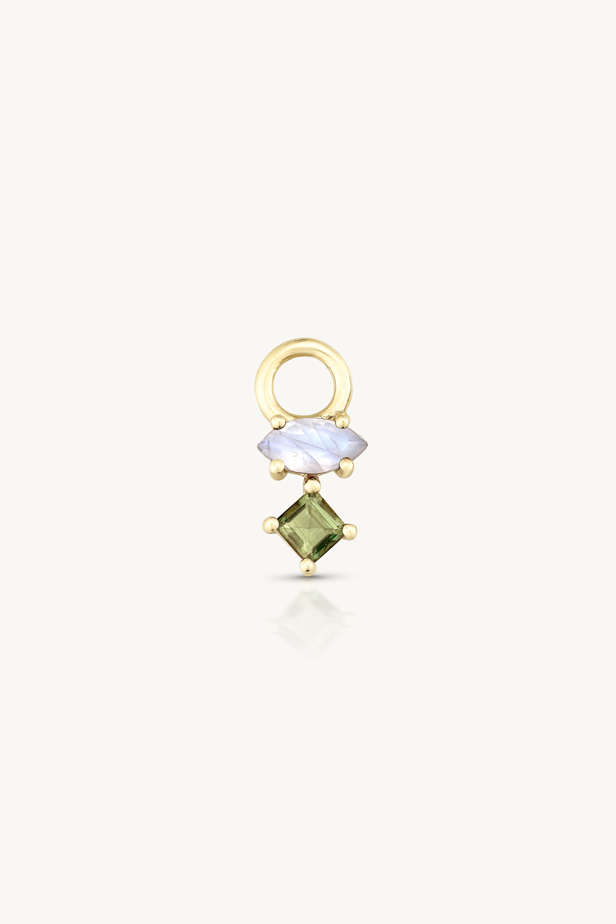 The Astrid Charm features two delicately set stones with a marquise Moonstone and baguette Apatite.