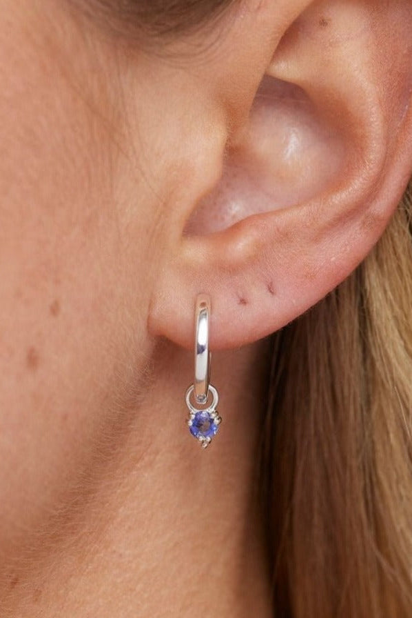 The Orb Earring Charm features a natural hand cut 4mm stone set with a double claw setting with 6 claws at 3 points around the stone. The charm is fixed onto its hoop.