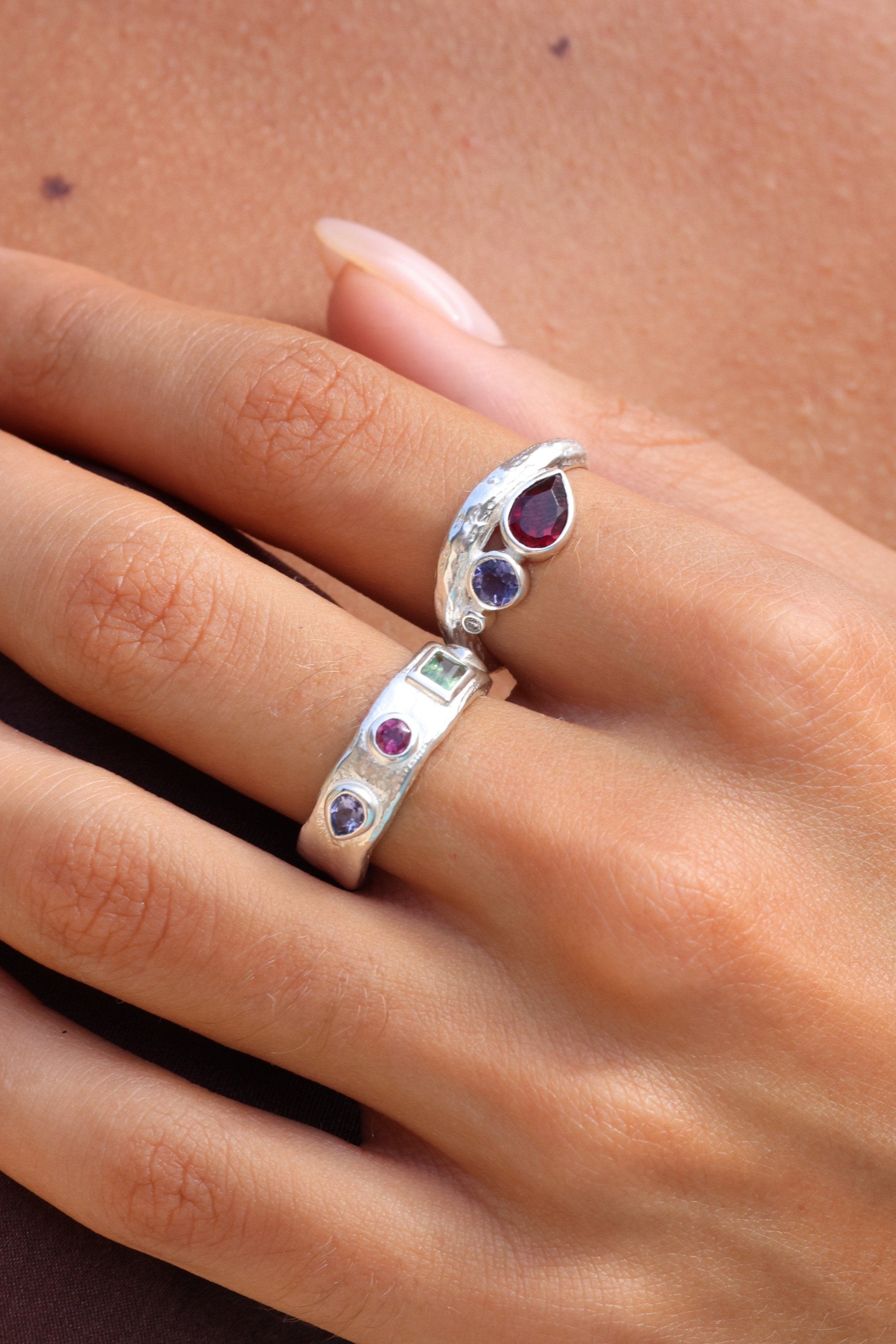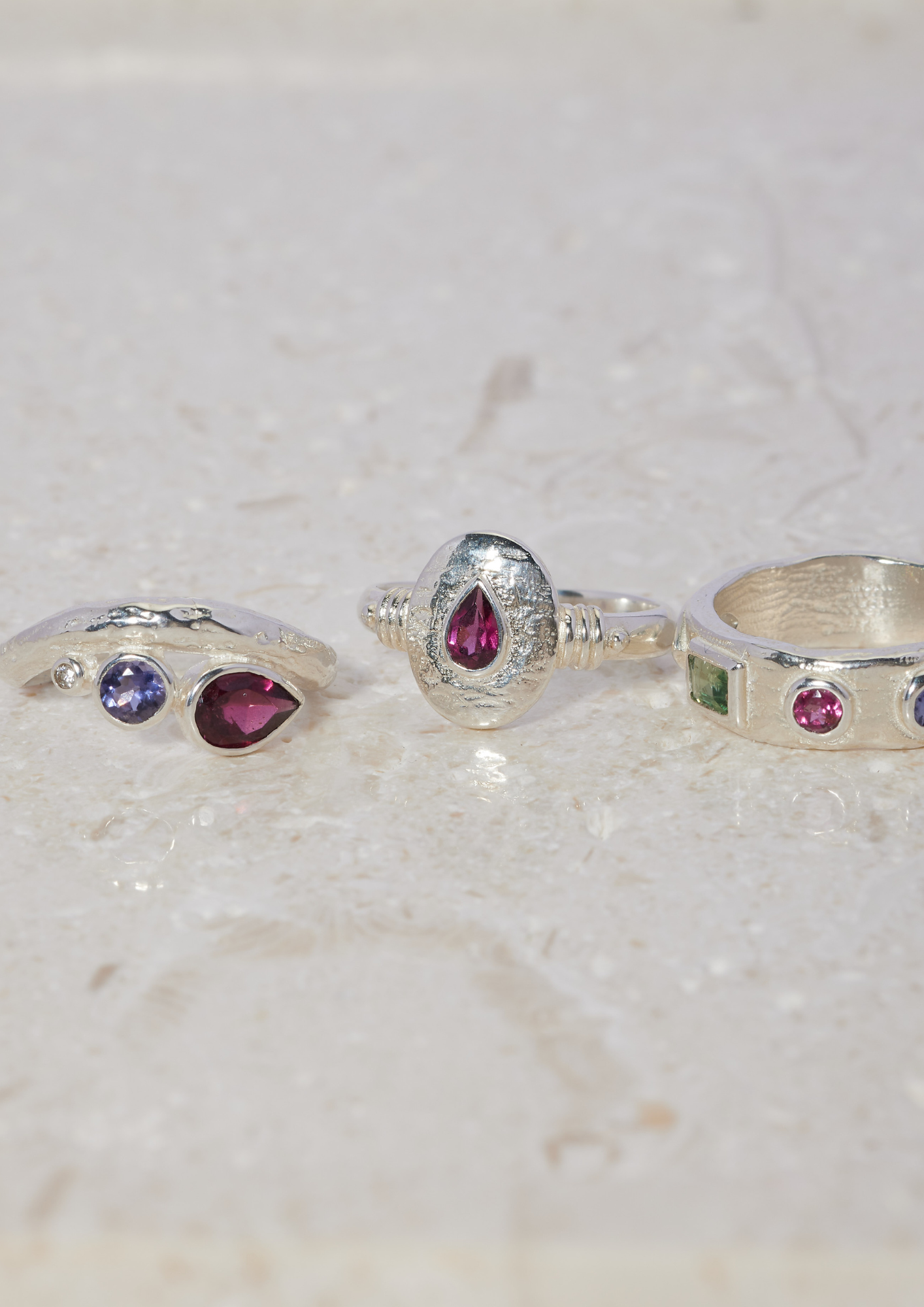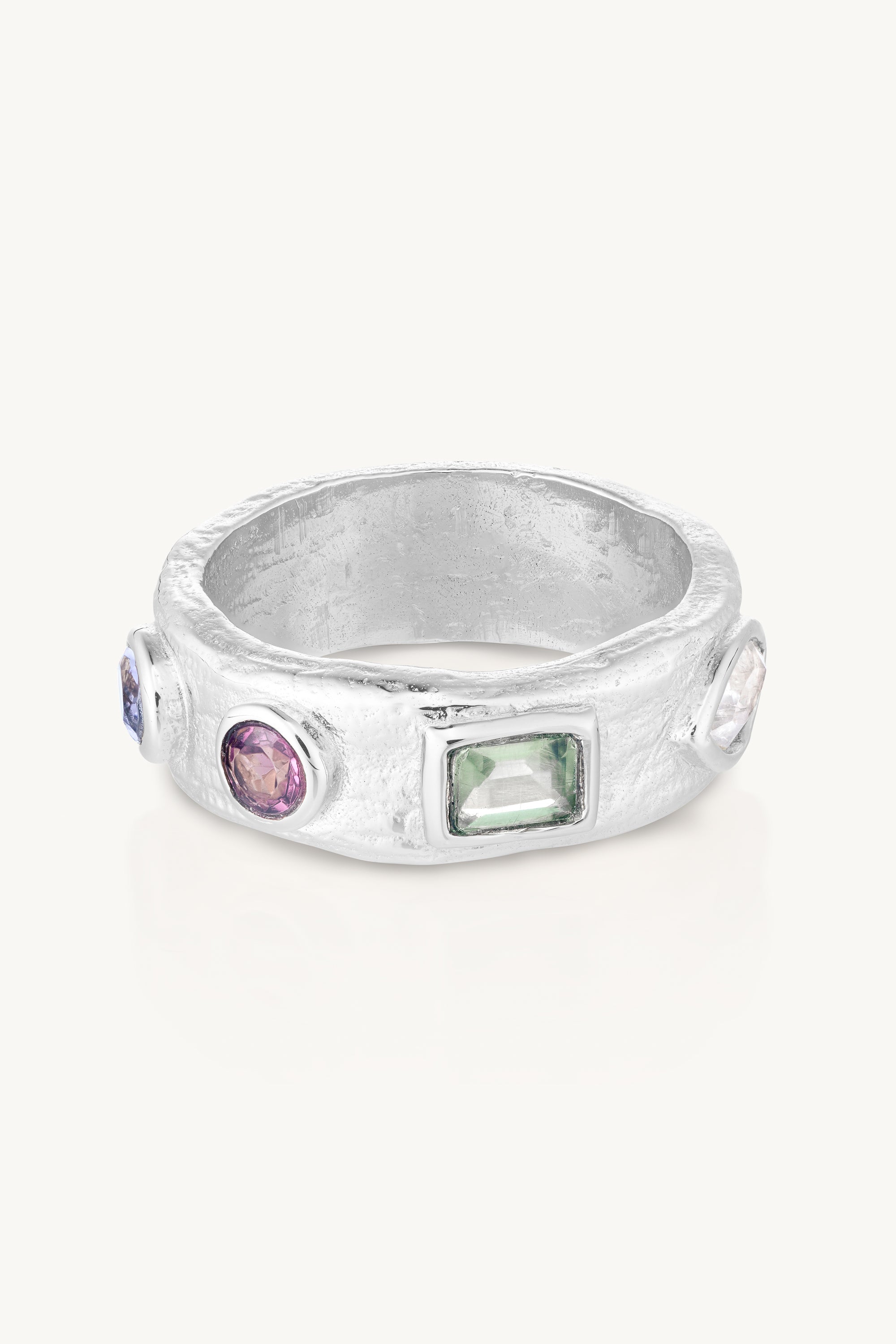 The Aria Ring is a statement stone set ring that heros our favourite kaleidoscope of jewels - Apatite, Moonstone, Iolite and Rhodolite. The stones are bezel set in a raised setting against the textured organic band.