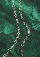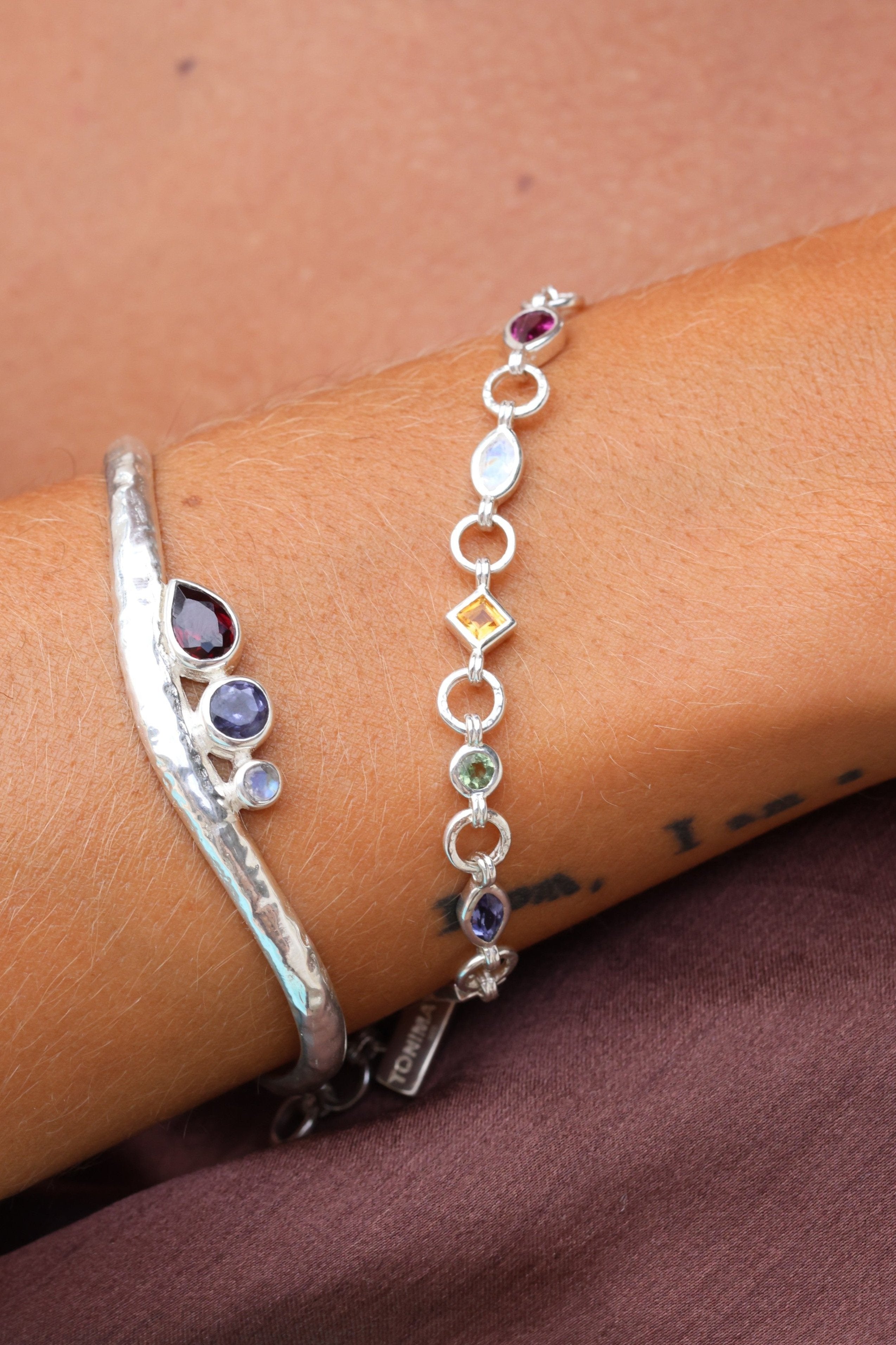 The Calypso Bracelet is a celebration of colour, embracing a kaleidoscope of natural hand cut stones. The Calypso uses Apatite, Iolite, Citrine, Topaz, Moonstone and Rhodolite stones, each with a unique size and shape.