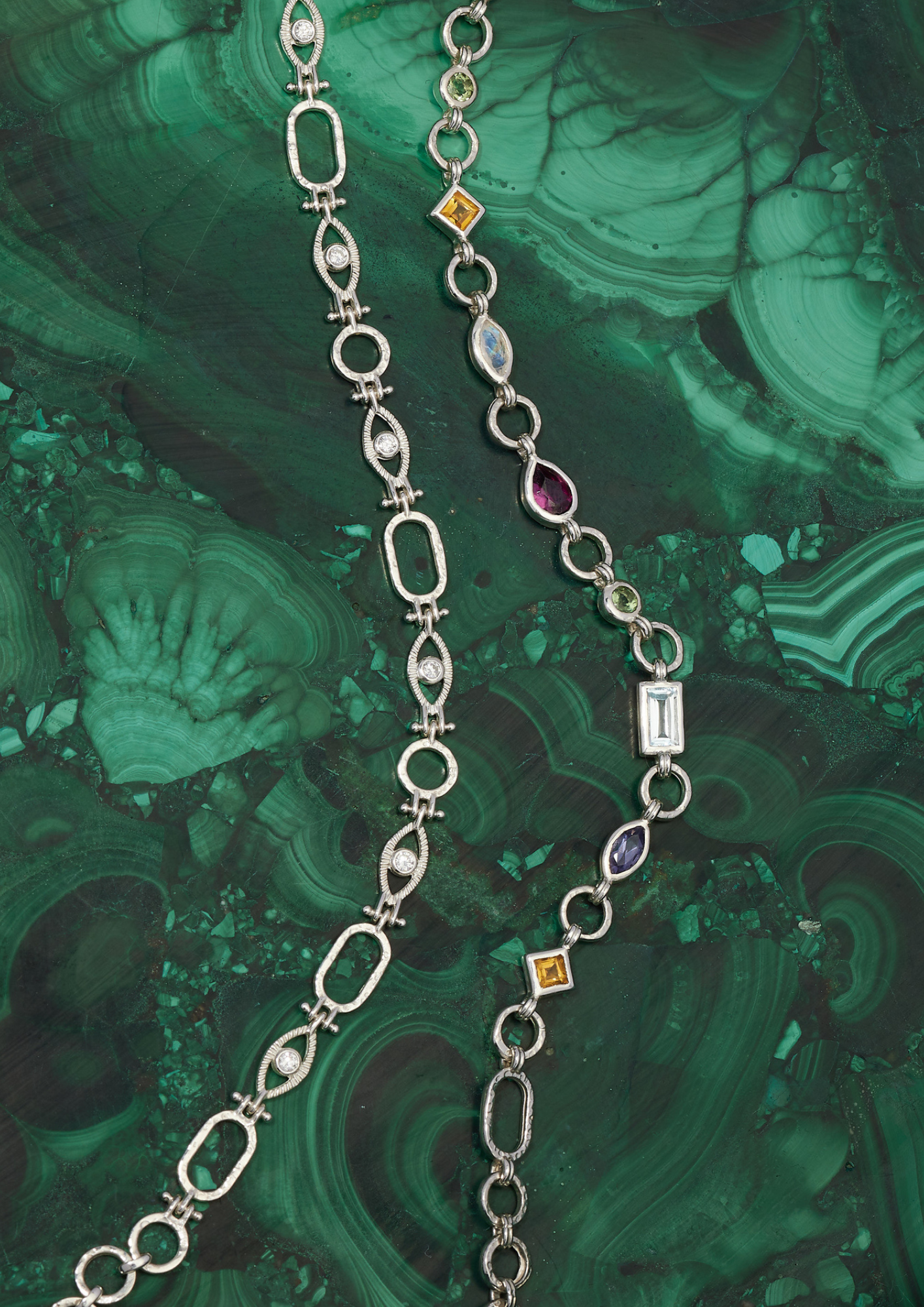 This style is truly a statement piece, with the chain and hinges meticulously handmade, featuring a lightly hammered and organic finish and bezel setting.