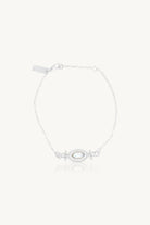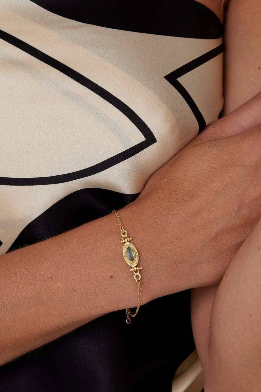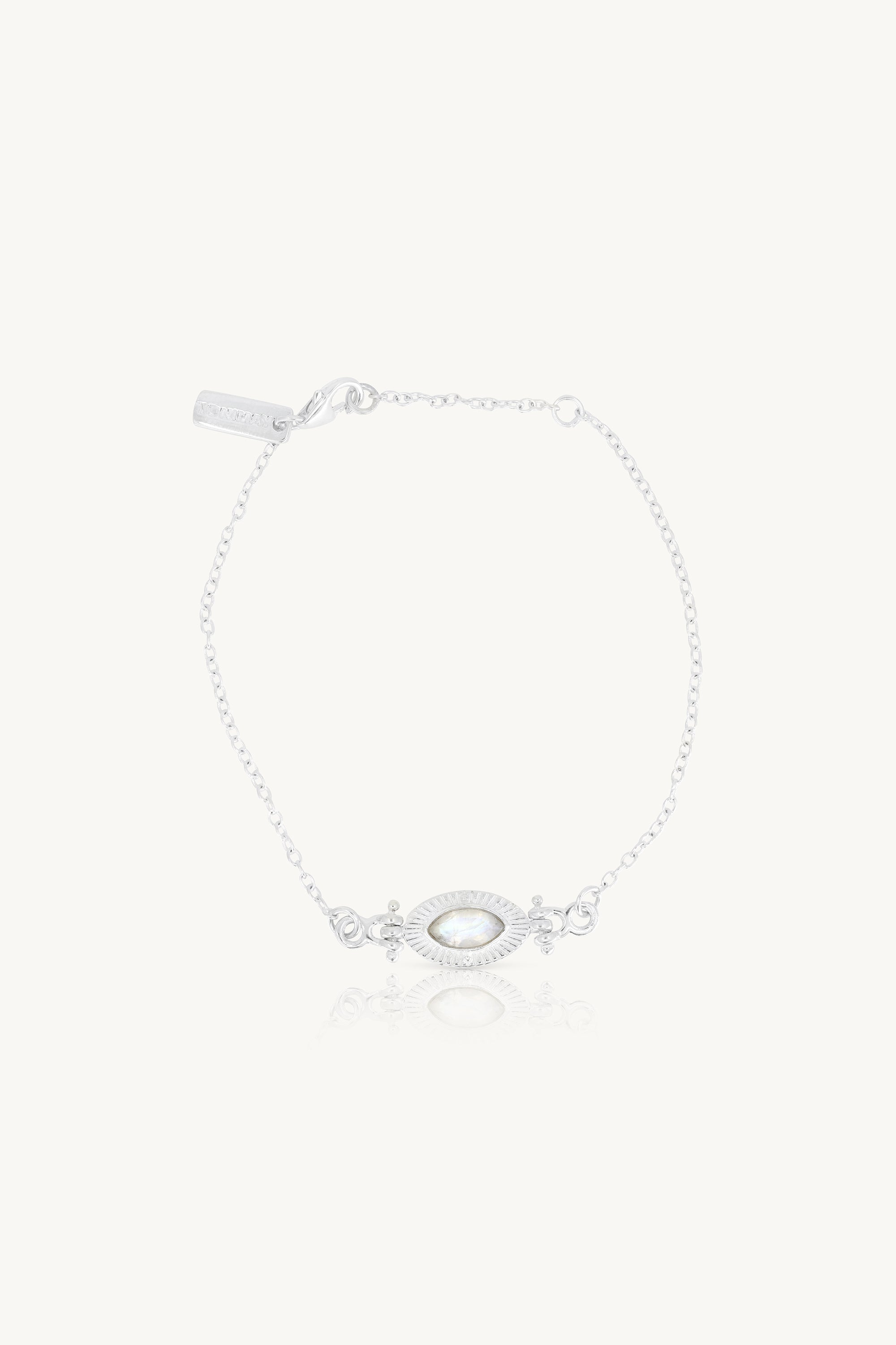 The Radiance Bracelet features a luminous handcut Moonstone bezel set with radiating lines illuminating from the stone. The face of the pendant has small dot detailing on either side of the stone, a modern day talisman inspired by ancient designs of the evil eye.