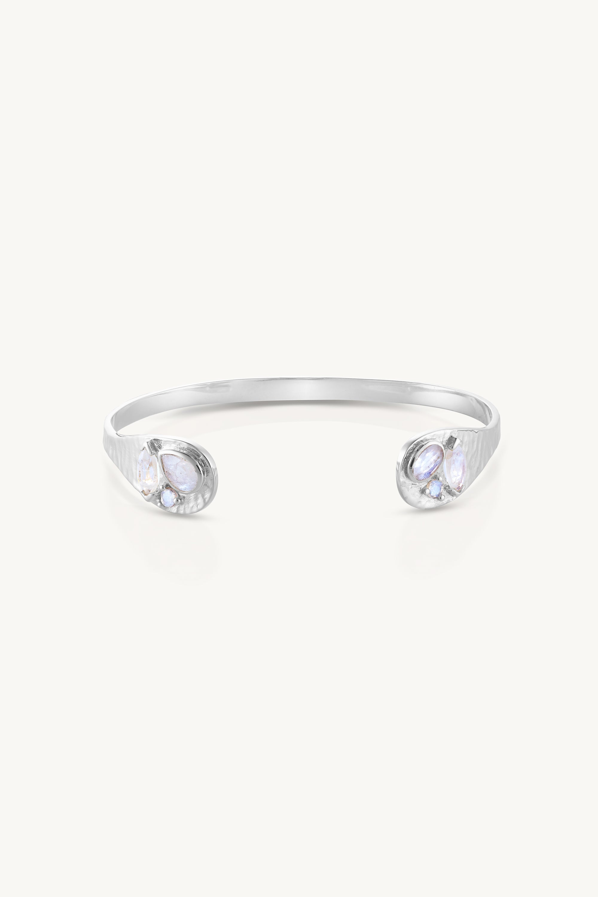 The Alessia Moonstone Cuff features 6 stunning hand cut Moonstones and a lightly textured hammered finish to the cuff which is designed to wear open at the top of the wrist.