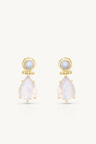 The Darcy's feature a radiant, natural hand-cut pear-shaped Moonstone, faceted to showcase the stone's natural flashes of colour. This gem is set below a delicate stud featuring a smaller, equally enchanting Moonstone.