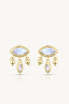 These earrings feature a bezel-set marquise Moonstone, radiating with subtle linework extending out. Suspended beneath are three charms, a petite ball charm on each side of a smaller, vertically set marquise Moonstone.