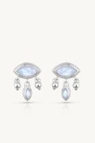 These earrings feature a bezel-set marquise Moonstone, radiating with subtle linework extending out. Suspended beneath are three charms, a petite ball charm on each side of a smaller, vertically set marquise Moonstone.