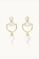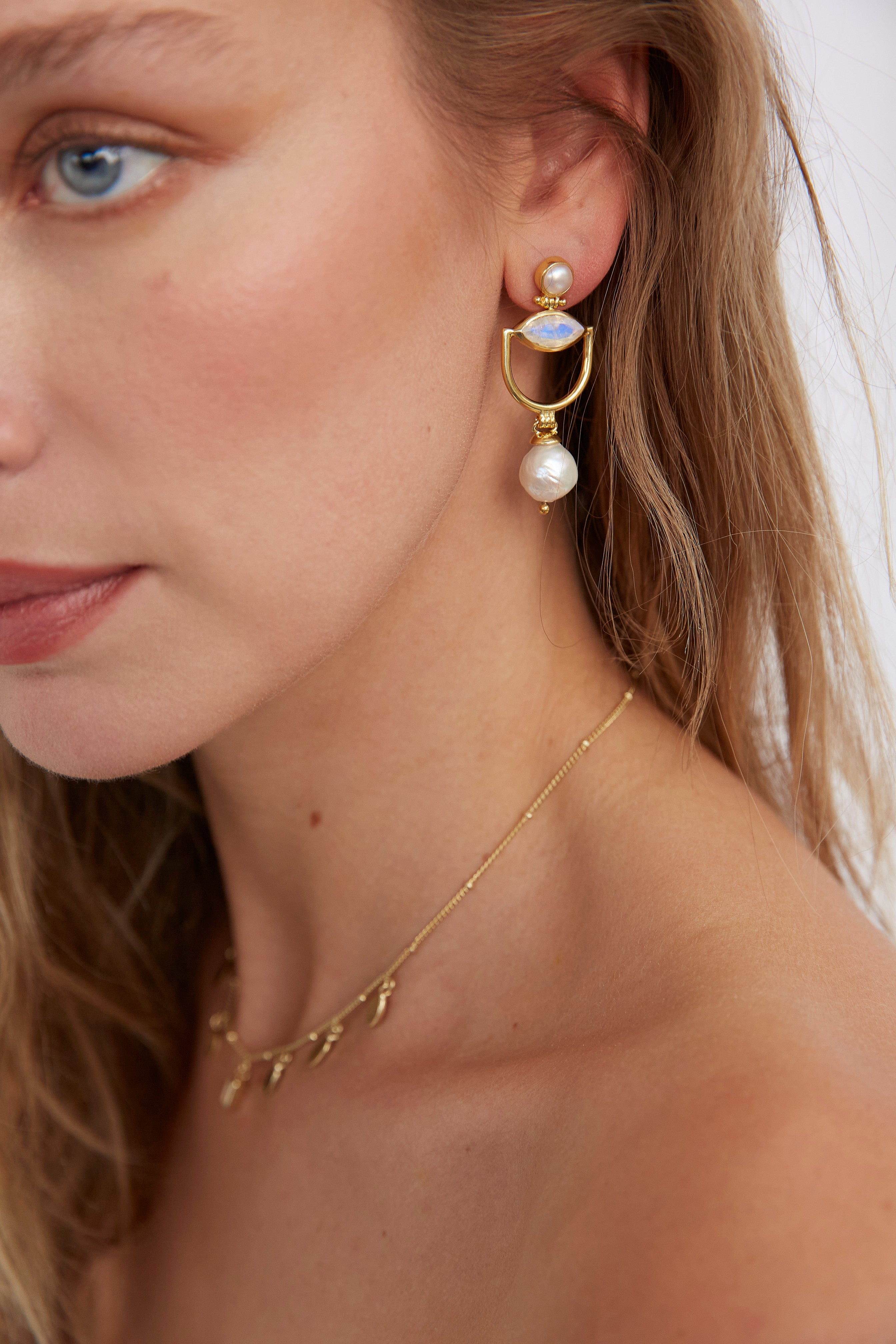 These unique earrings feature a luminous hand-cut marquise Moonstone set below a Freshwater Pearl stud with the gold detailing of the earring arching down to a Freshwater baroque Pearl.