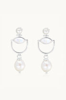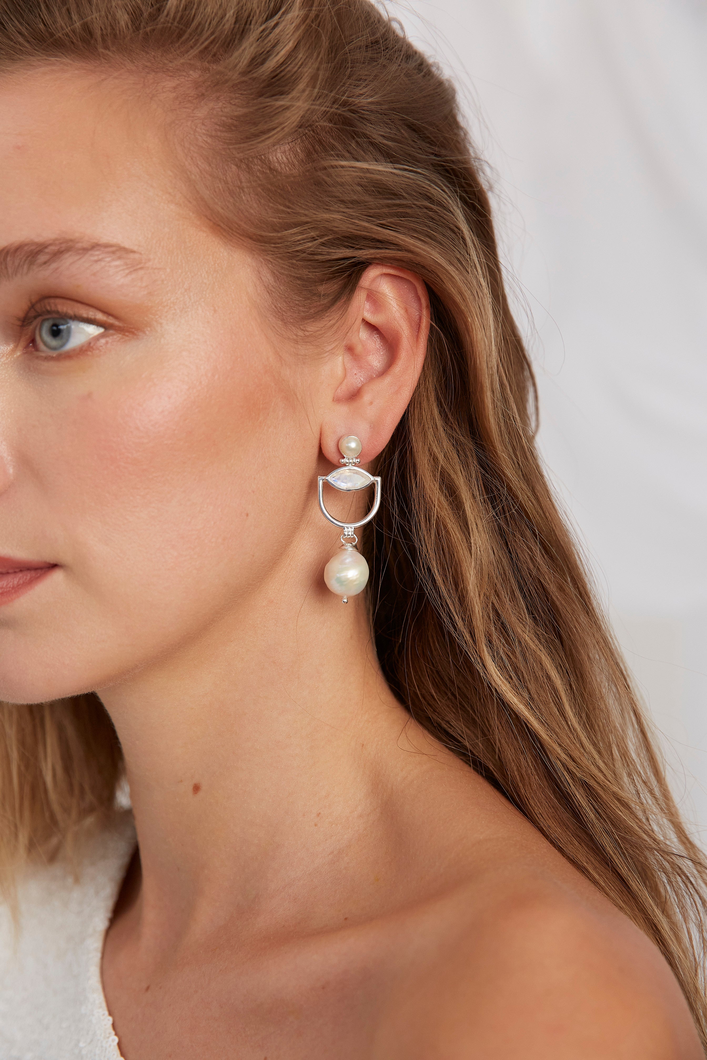 These unique earrings feature a luminous hand-cut marquise Moonstone set below a Freshwater Pearl stud with the silver detailing of the earring arching down to a Freshwater Baroque Pearl.