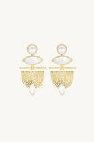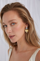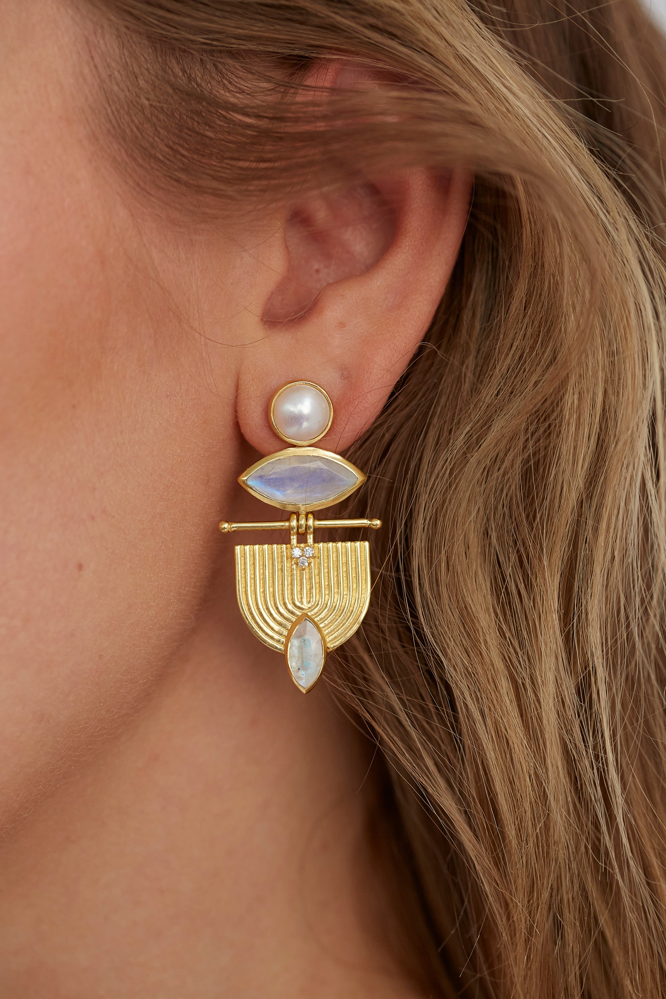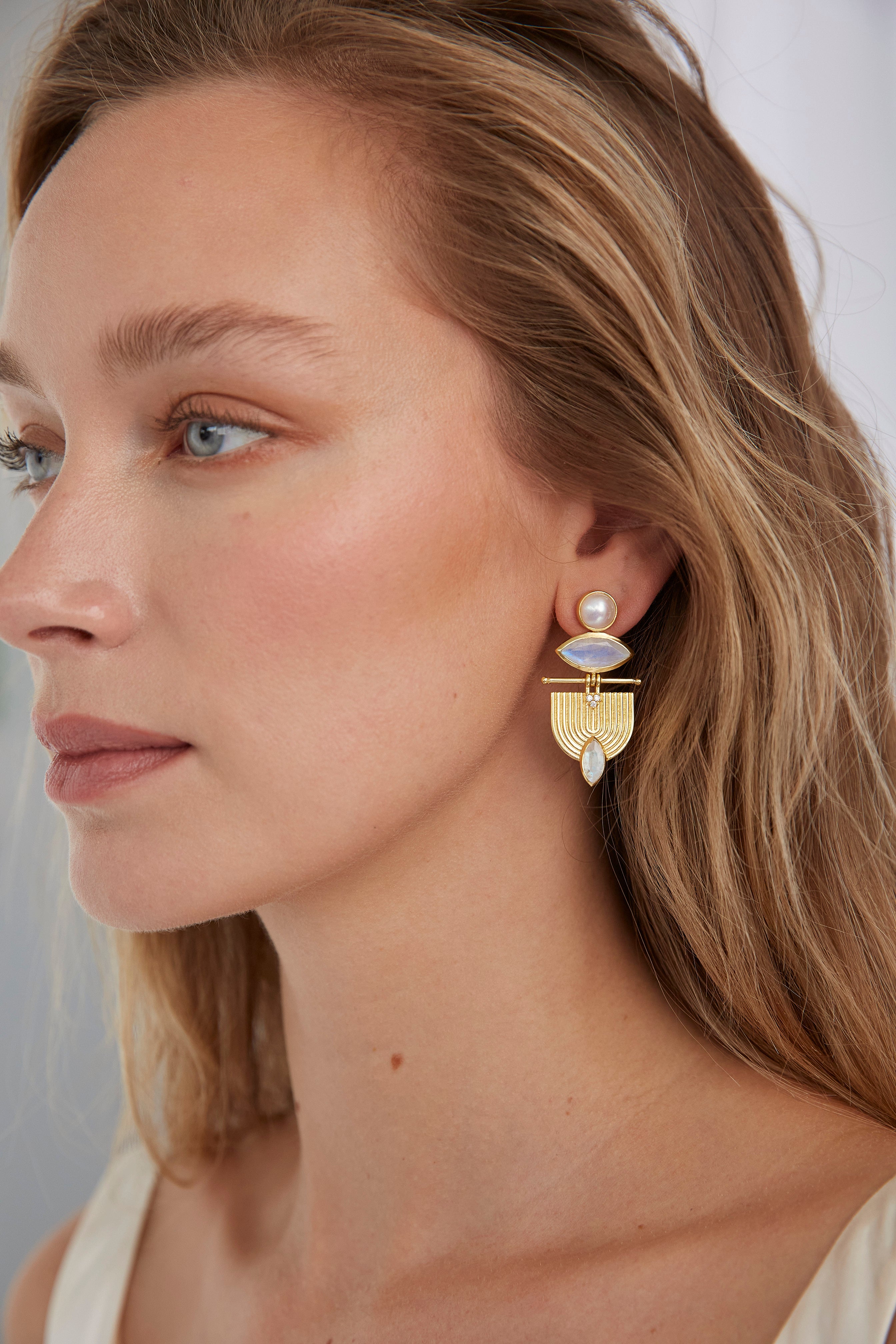 These earrings are an edgy take on a traditional wedding earring feature a luminous hand-cut marquise moonstone set below a freshwater pearl stud with the gold detailing of the earring arching down to a freshwater pearl baroque pearl. The gold detailing on these earrings feature a barred hinge and radiating arch of gold.