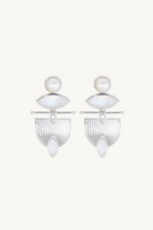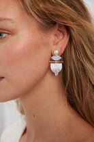 These earrings are an edgy take on a traditional wedding earring feature a luminous hand-cut marquise moonstone set below a freshwater pearl stud. The gold detailing on these earrings feature a barred hinge and radiating arch of gold.