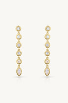 These striking earrings feature a cascade of six natural handcut faceted Moonstones, each meticulously claw-set by hand. The design creates a radiant trail, beautifully extending on the Petite's with an additional three Moonstones, culminating in a gorgeous marquise Moonstone at the end.