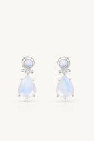 The Darcy's feature a radiant, hand-cut pear-shaped Moonstone, faceted to showcase the stone's natural flashes of colour. This gem is set below a delicate stud featuring a smaller, equally enchanting Moonstone.