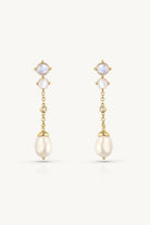 These stunning earrings feature two stacked hand-cut faceted Moonstones, with a delicate chain that drops down from the stud to suspend a natural baroque Freshwater Pearl, adding a touch of elegance and movement.