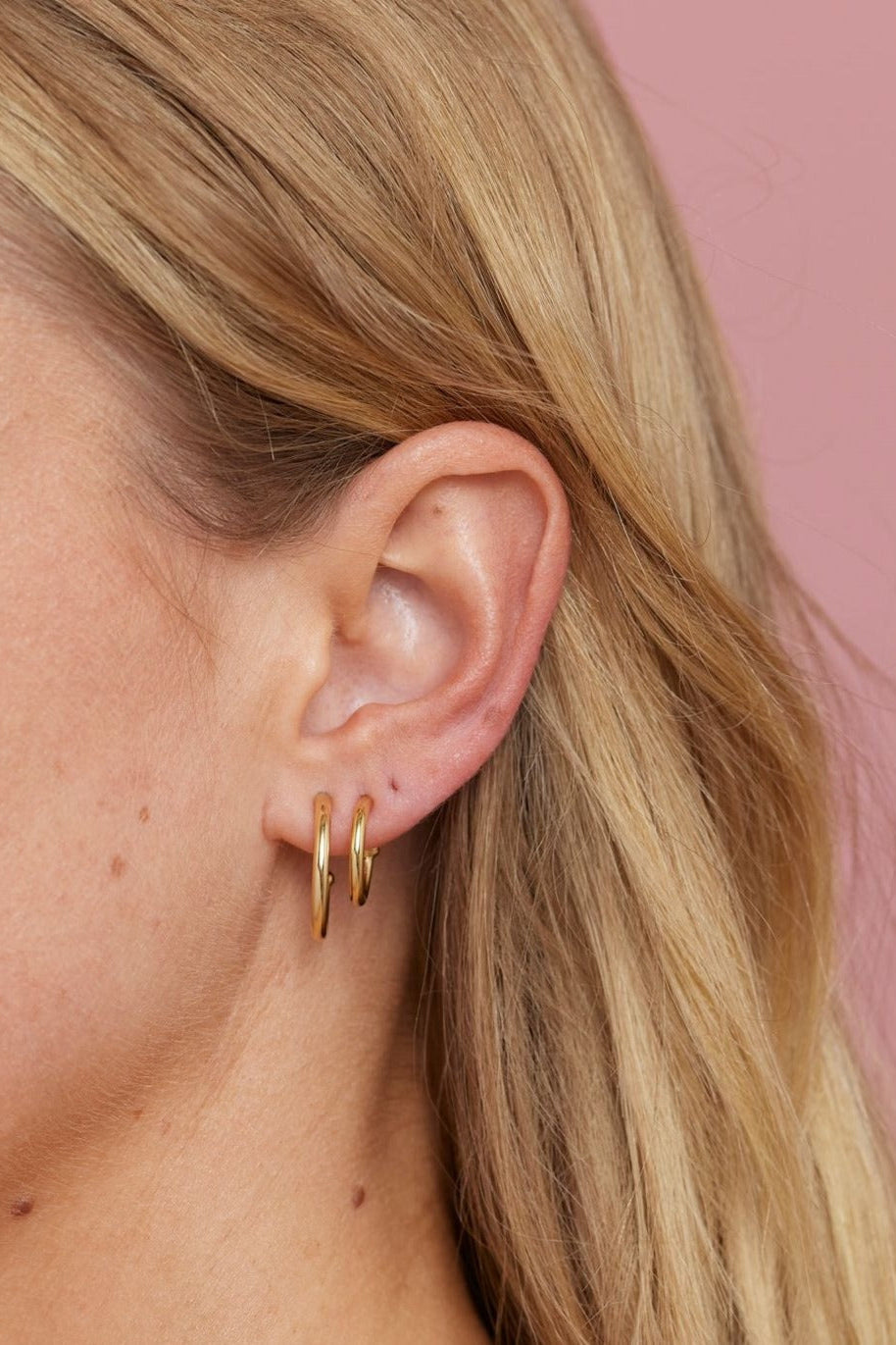 Our Polished Gold Hoops are designed to be layered and worn with our collection of earring charms. A stud backed hoop, these are designed in two sizes with a high polished finish.
