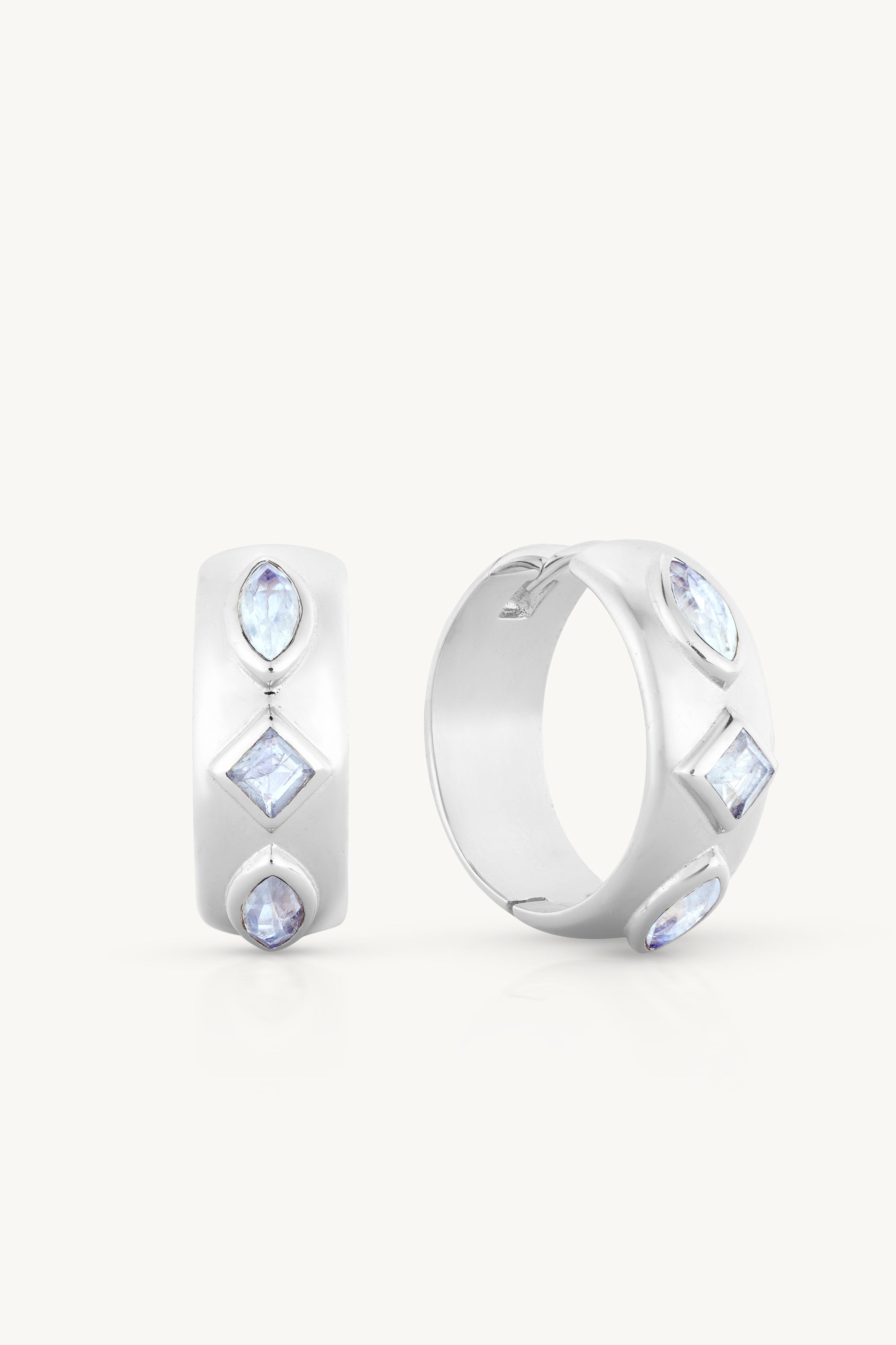 This hoops features baguette cut and Marquise Cut Moonstones bezel set into a domed hoop with a slightly raised stone setting.