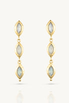 The Isabella Earrings are the big sister to our Belle Huggies. Featuring 3 stunning hand set luminous Rainbow Moonstone stones, these drop earrings are a true statement earring perfect for that special occasion whether it be date night, a wedding or a long lunch.