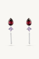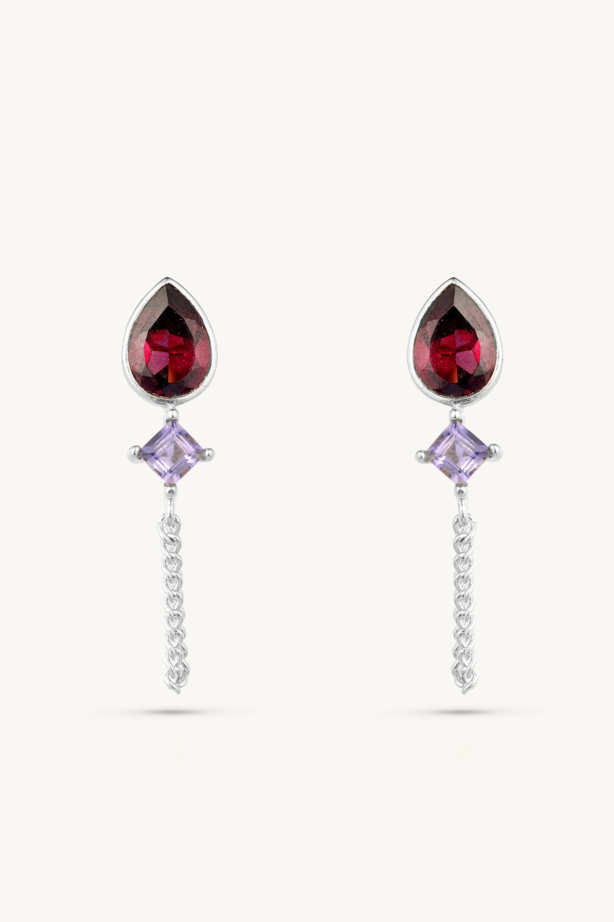 The Valentina Chain Studs are soon to become your new favourite earrings! The earrings feature a pear cut Rhodolite and Iolite stone, connected with a delicate chain that is attached to the backing of the earrings and swings from the ear.