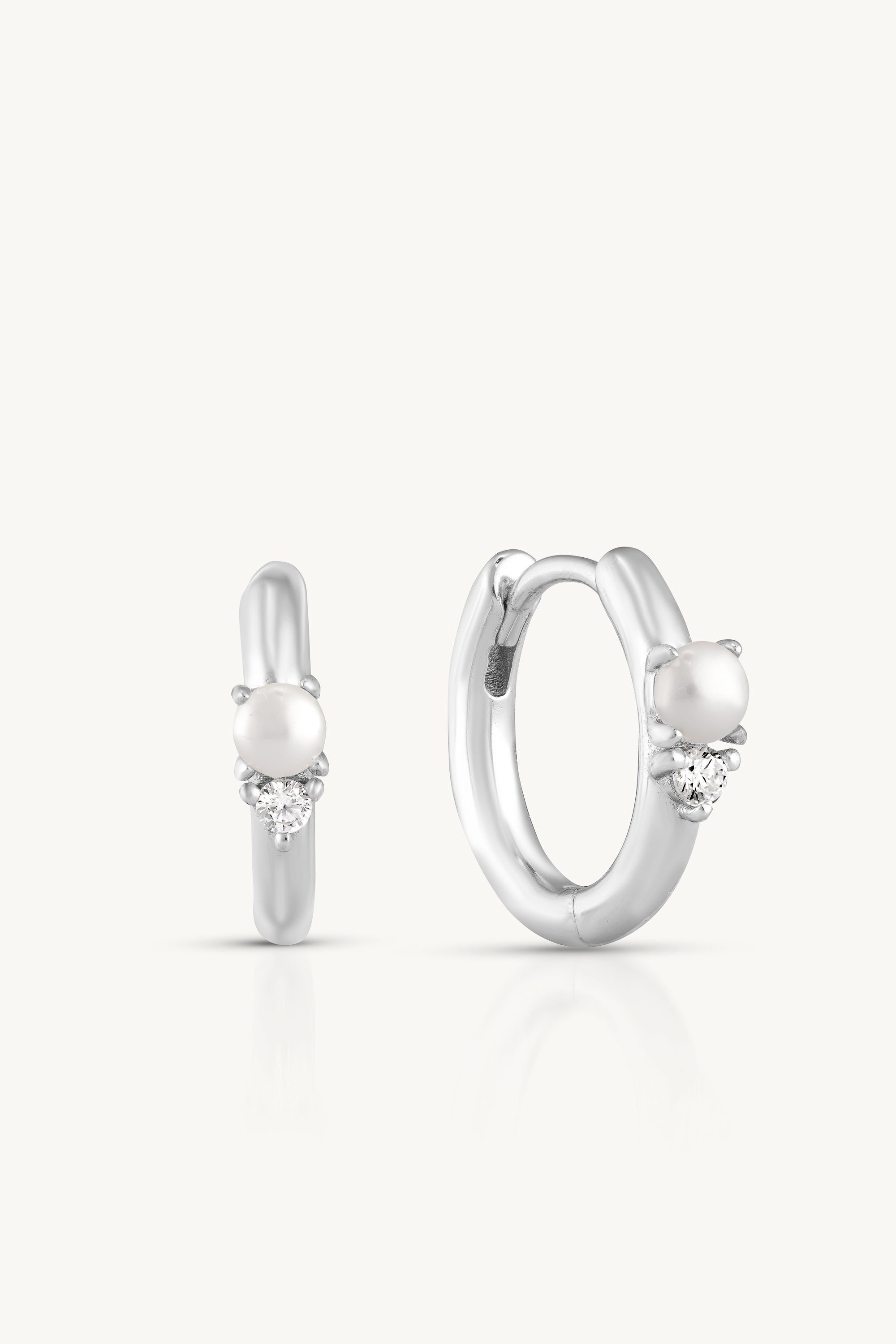 These huggies bring together a round Pearl and a sparkling Cubic Zirconia prong set for effortless layering or solo shine.